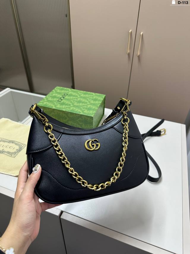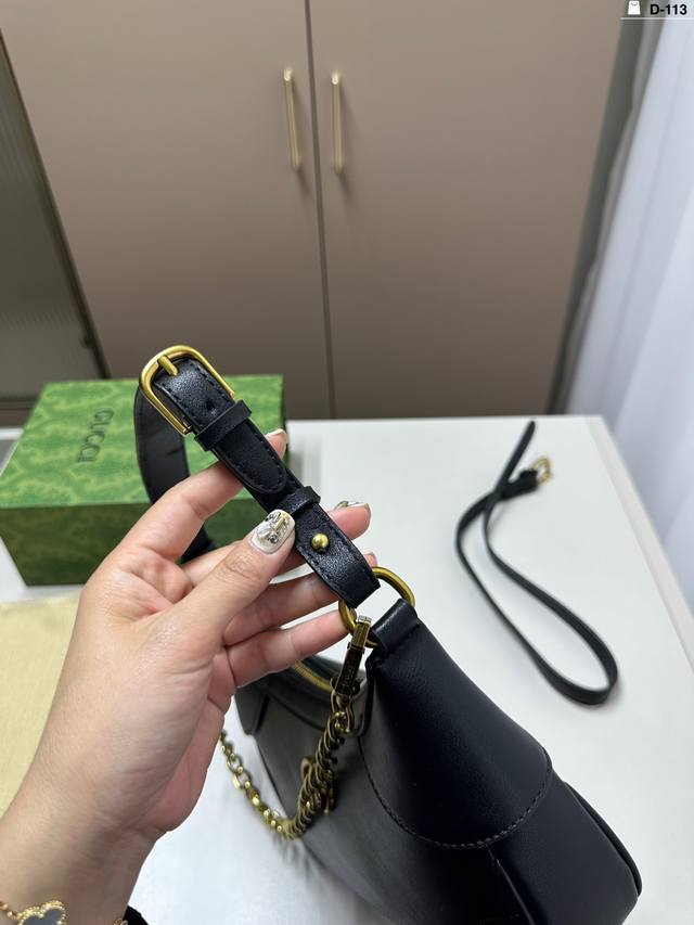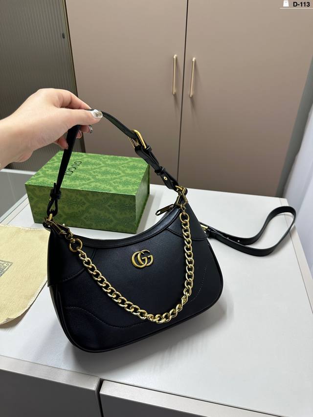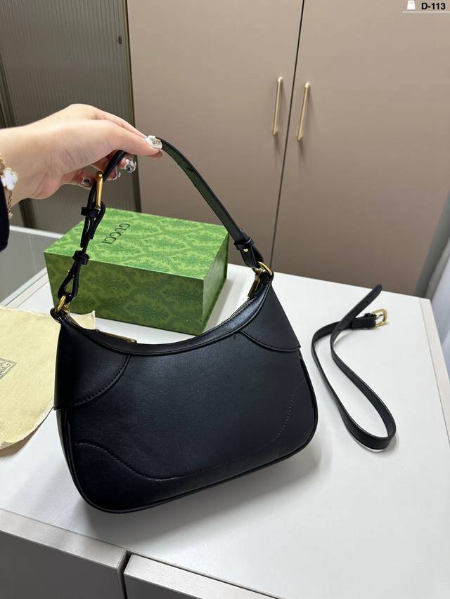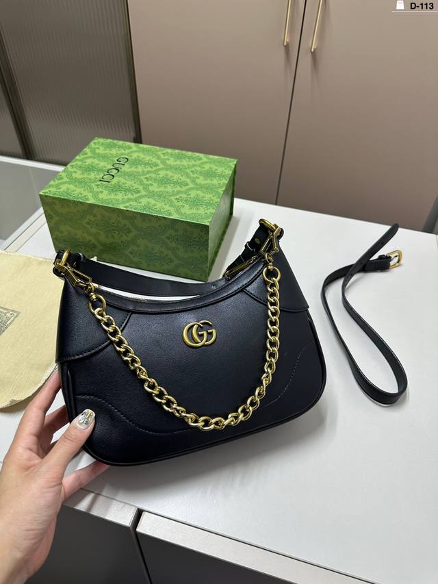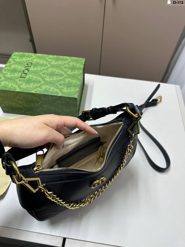酷奇新款gucci 腋下包 全新新月包型,从品牌典藏元素汲取灵感,饰有20世纪70年代经典双g标志,并配有两根肩带,一条皮质,一条金属,诠释了品牌所推崇的实用设计理念。D-113