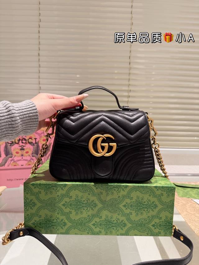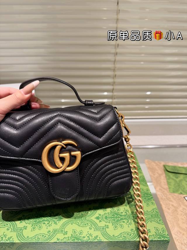 Gg Marmont 邮差包 系列链带肩背包采用颇具结构感的柔软造型和超大号翻盖封口,配以双 G 金属配件。可滑动链条肩带有多种背法,可在肩背和手提之间自由转换。采用波浪纹绗缝皮革,背面配以 Gg 标志专柜热销爆款尺寸小号21 15Cm
