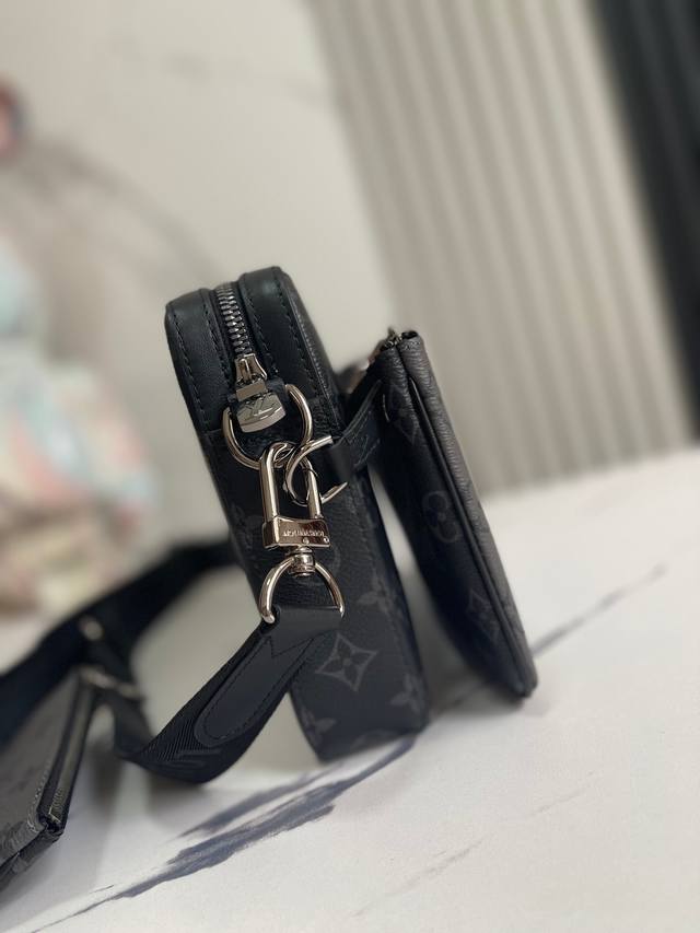 顶级外单 独实家拍 M69443黑灰 Trio 邮差包由 Monogram Eclipse 帆布与 Monogram Eclipse Reverse 帆布制成。标志性的同色调灰色图案凸显此多功能拼搭设计品的线条。除具备传统斜跨手袋的功能外,另配可脱卸拉链袋和附于包带上的零钱包。小包:12×7 Cm中包:24×15 Cm大包:26×5×18 Cm