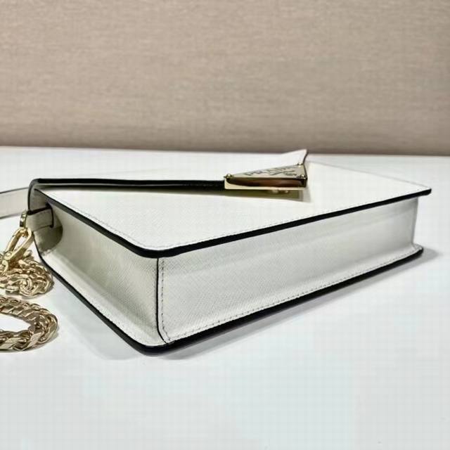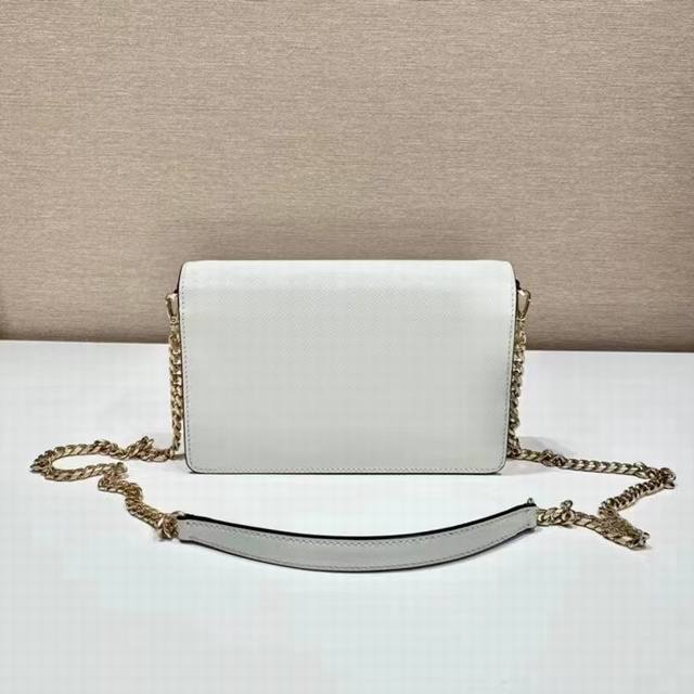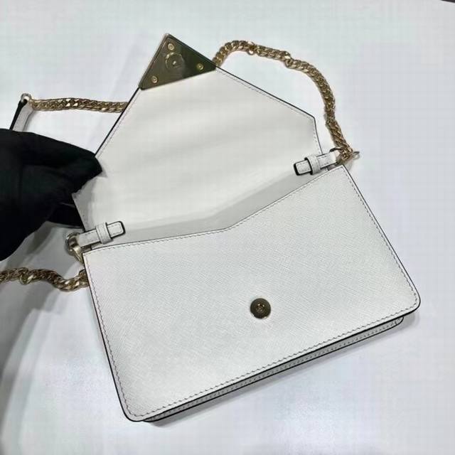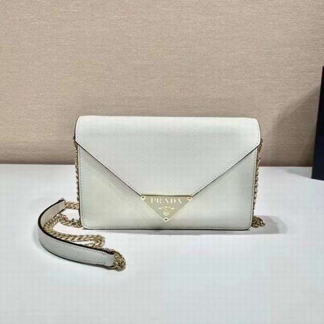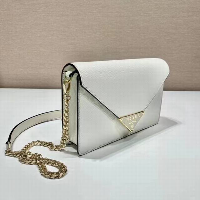 这款翻盖式单肩包采用saffiano皮革打造,内配小羊皮。展现匠心设计,柔美设计一览无余。翻盖开合的尖端饰以涂珐琅金属三角形徽标,配有可拆卸长肩带 又可当手包精致的迷人魅力,简约大气,值得拥有。赶紧入手吧