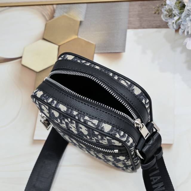 配老虎盒子!配头层荔枝纹牛皮 D家这款信使包是本季新品,精巧实用,是日常的理想良伴。采用米色和黑色 Oblique 印花面料精心制作,饰以黑色粒面牛皮革细节。拉链隔层和正面口袋可收纳各种日常用品,搭配可调节的肩带,可肩背或斜挎。型号:1044 尺寸:14.5×18×6Cm