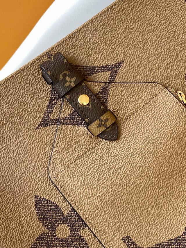 M46823 顶级原单 动态变码 本款 Onthego Voyage 托特包以 Giant Monogram 帆布和 Monogram Reverse 帆布分饰两面,演绎二合一的设计理念:内层的拉链手拿包可巧妙化身腰包,收纳护照与手机。考究设计方便固定于 Lv Horizon 行李箱,可拆卸并调节肩带实现自在出行体验。43.0 X 33.0 X 18.5 厘米 长 X 高 X 宽