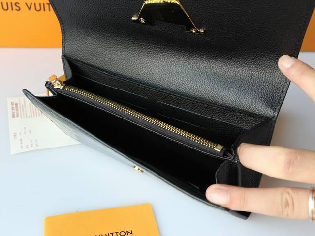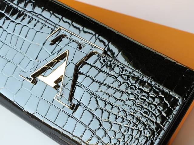 / 颜色 黑尺寸 20X11M99002 Capucines 钱夹取材雍容鳄鱼皮,流畅线条暗藏充裕空间。翻盖的 Lv 按扣与新古典主义 Capucines 手袋的标