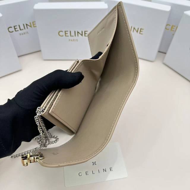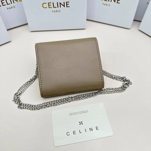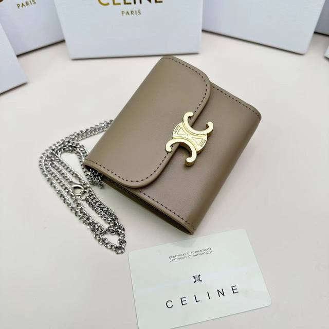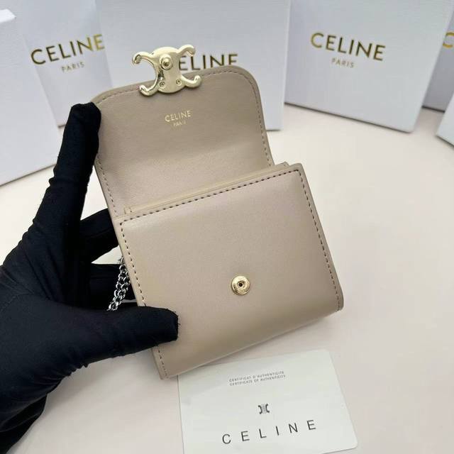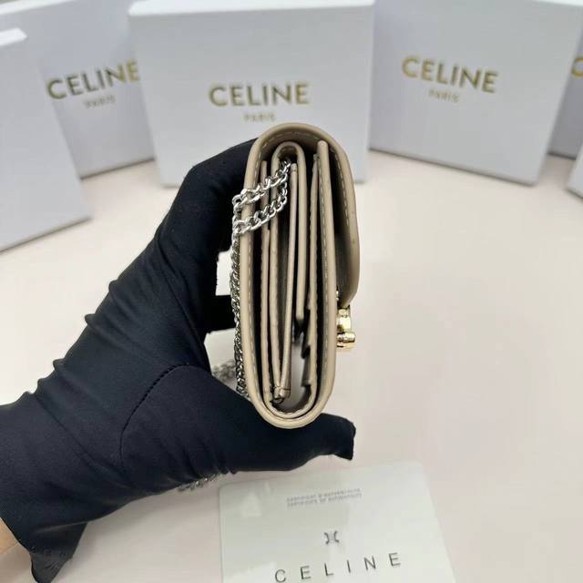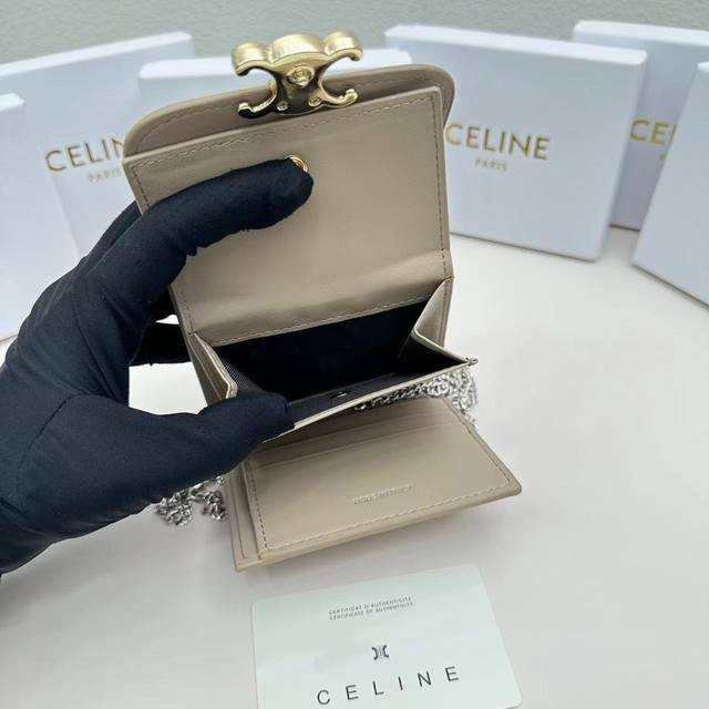 Celine新款链条Triomphe名片包,可斜挎,经典花纹大面内配平纹超纤,金色饰面Triomphe金属按扣开合,1个加厚主隔层,3个内侧卡槽...