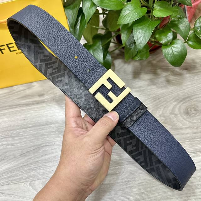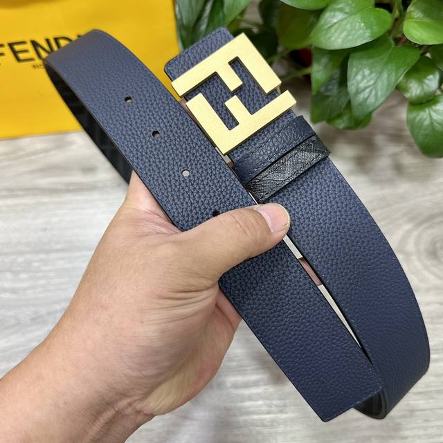 / Fendi 芬迪 专柜同款 宽4.0Cm 双环正反用腰带 Ff按钉搭扣 深蓝色cuoio Romano皮革材质 反面面料带有烟草黄和黑色ff图案 四方金属饰面