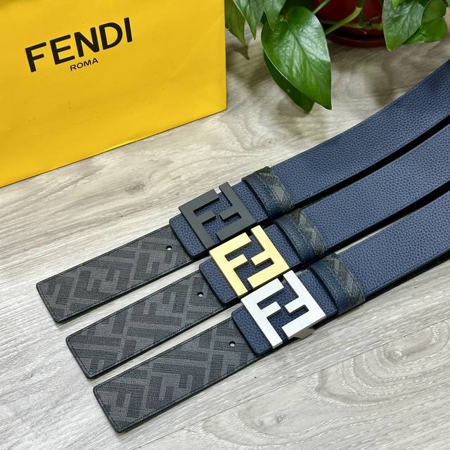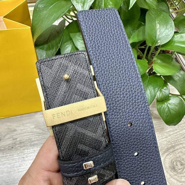 Fendi 芬迪 专柜同款 宽4.0Cm 双环正反用腰带 Ff按钉搭扣 深蓝色cuoio Romano皮革材质 反面面料带有烟草黄和黑色ff图案 四方金属饰面 时尚经典 百搭款