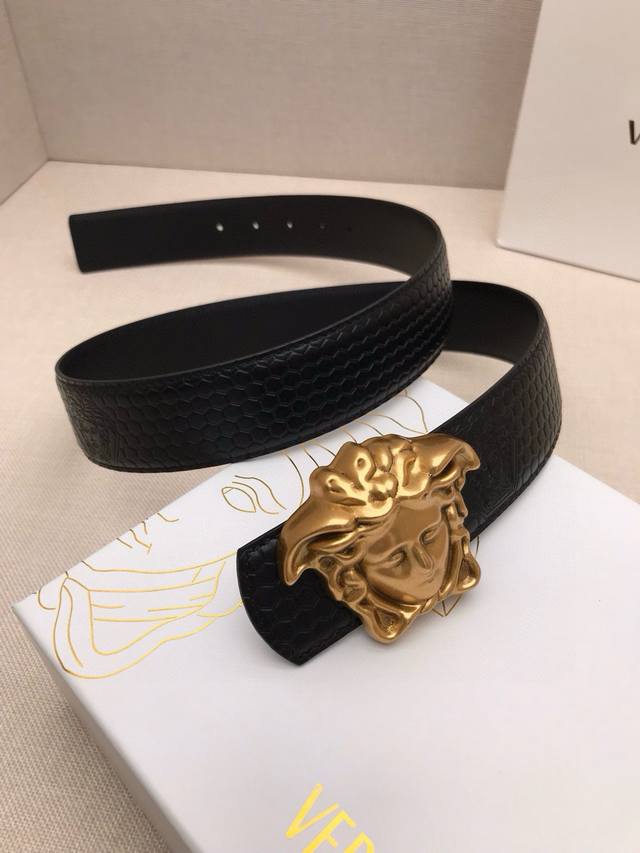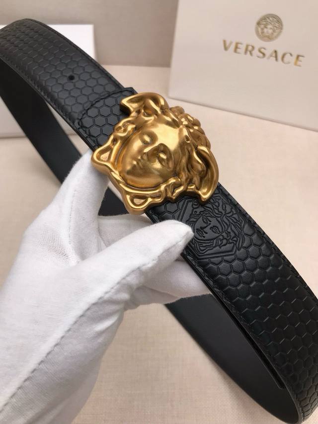 范思哲 采用高级 Signature真皮精制而成,触感厚实,饰以范思哲美人头商标带扣。腰带为意大利尺寸,请在购买前参阅腰带尺寸指南. 3.8Cm 宽