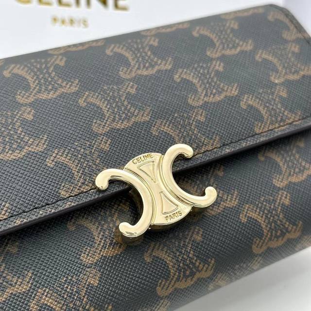 Celine新款卡包,Triomphe翻盖卡包,经典花纹大面内配平纹超纤,旋转锁扣开合,1个加厚主隔层,2个内侧卡槽。 编号:10M473...