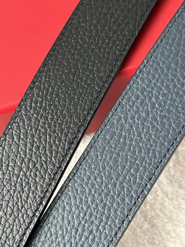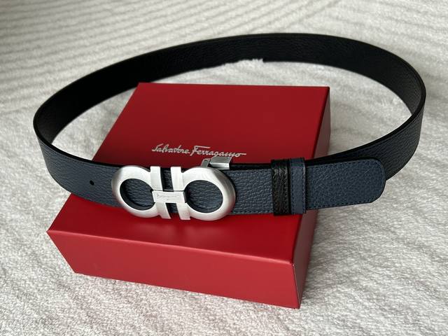 菲拉格慕 专柜同款 男士双面用 平板双面荔枝纹一面黑一面蓝色 经典8字扣拉丝白色 宽3.4Cm 商务休闲简约百搭