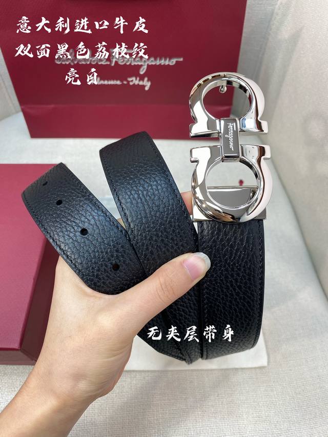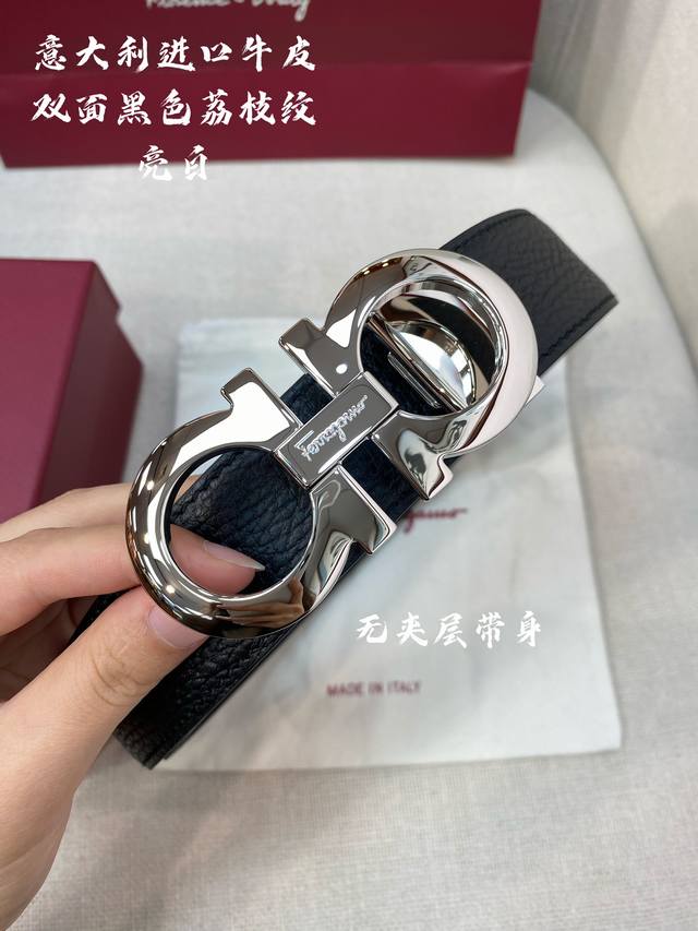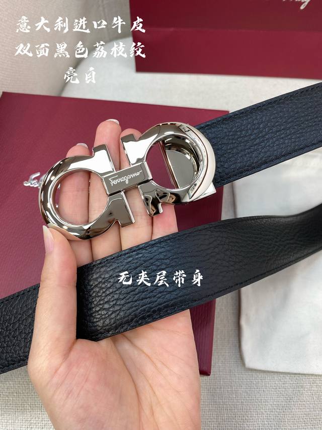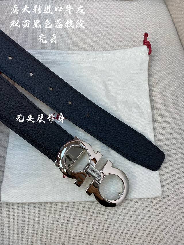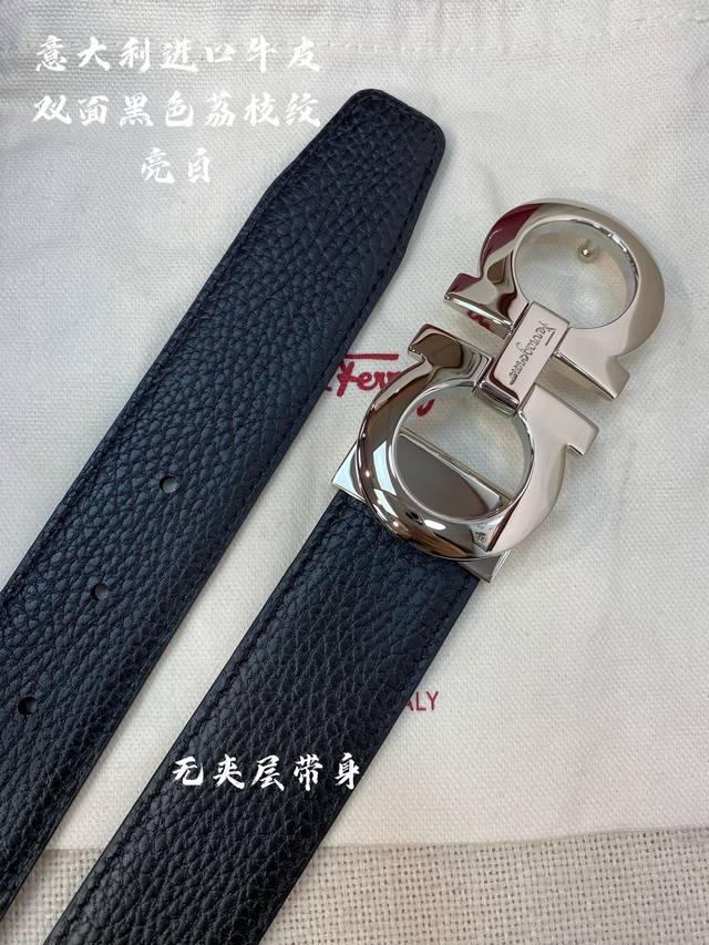 菲拉格慕 原单双面进口小牛皮带身.黑色与咖啡色一体,正反两面可用,搭配原单精品钢扣。原产皮料定制,专柜宽度3.5Cm....