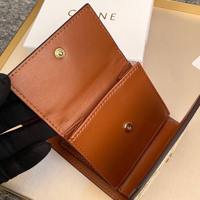 Celine新款卡包,Triomphe名片包,经典花纹大面内配平纹超纤,金色饰面Triomphe金属按扣开合,1个加厚主隔层,3个内侧卡槽。...