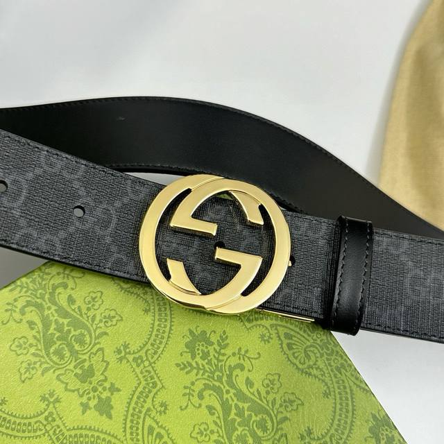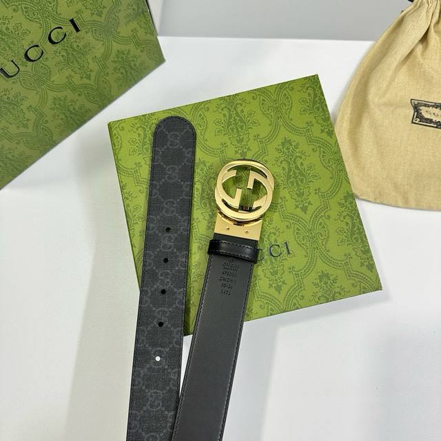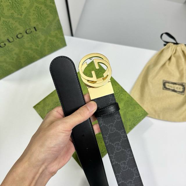 Gucci 黑灰pvc老花 小牛皮黑底 宽度3.5Cm 圆双g旋转扣 双面可用 可裁剪
