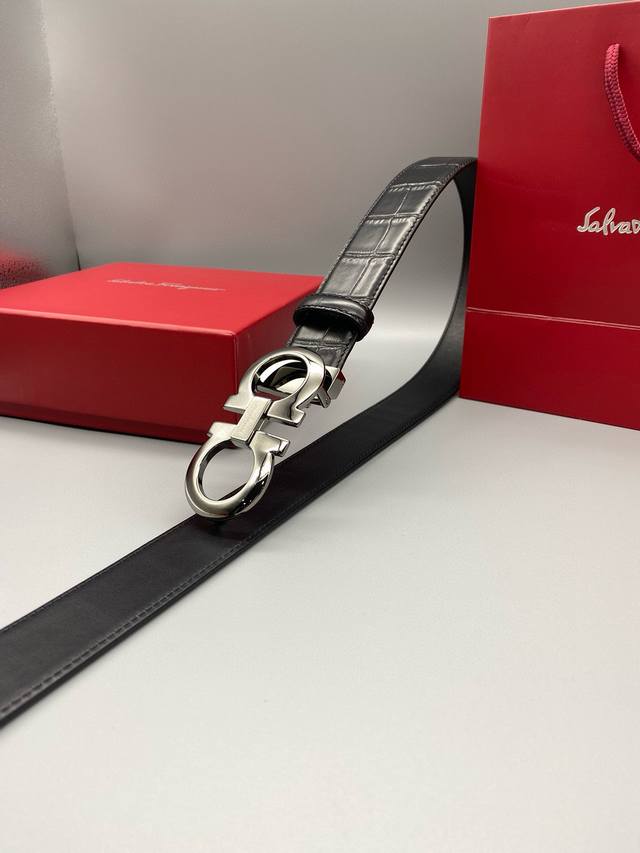 Ferragamo菲拉格慕男士3.5Cm精品金属扣,加厚电镀层耐磨损不易褪色不易掉色防过敏,再搭配上头层牛皮鳄鱼纹理,百搭耐看不过时。