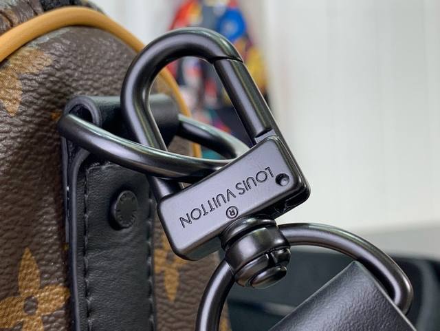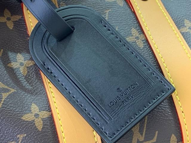 本款 Keepall Bandoulière 25 手袋选用 Monogram Macassa 涂层帆布,以鲜明皮革侧带注入醒目色彩。手柄环下方的金属铆钉呈现雾面质感,点缀标识的宽幅织物肩带方便肩背和斜挎。