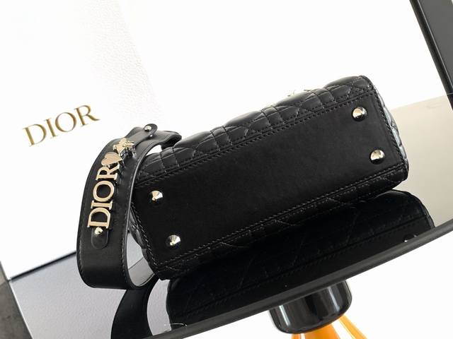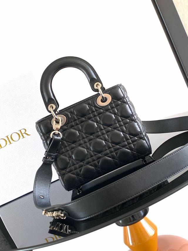 这款 Lady Dior Dior 手袋集中体现了 Dior 对优雅和美丽的深刻洞见。采用羊皮革精心制作,以藤格纹缉面线打造醒目的绗缝细节,时髦典雅的设计经久不衰。缀有浅金色饰面金属 D.I.O.R. 吊饰,彰显优雅气质。小号款式,设计别致,肩带可饰以徽章彰显个性,可手提或斜挎。
