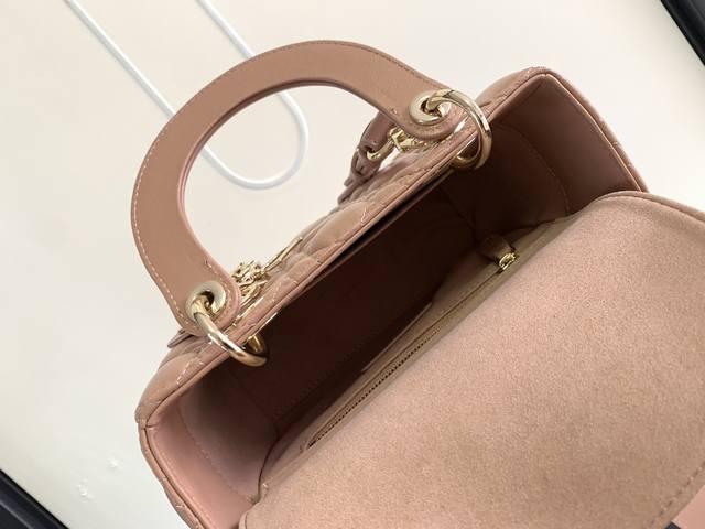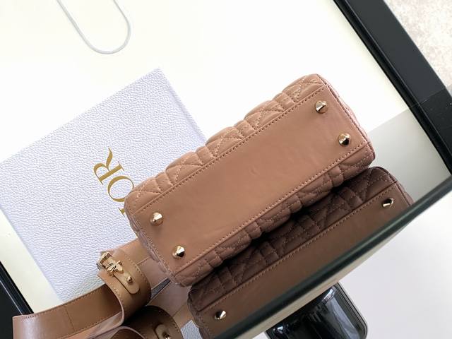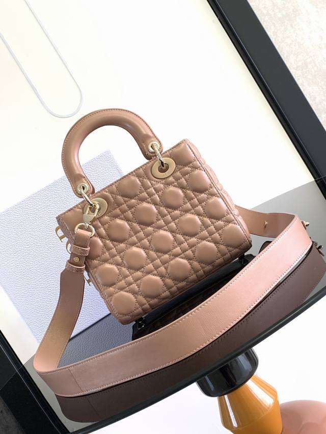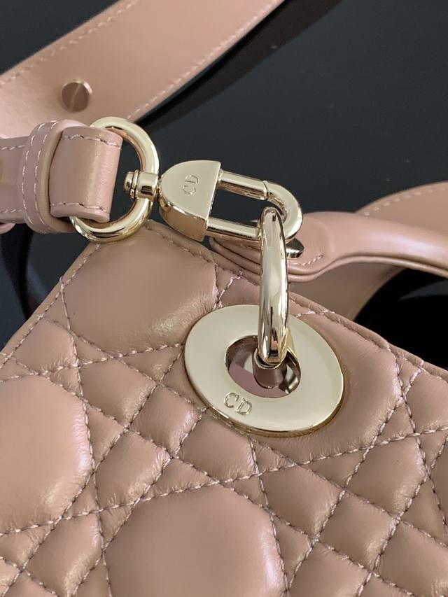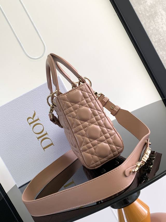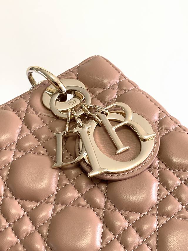这款 Lady Dior Dior 手袋集中体现了 Dior 对优雅和美丽的深刻洞见。采用黑色羊皮革精心制作,以藤格纹缉面线打造醒目的绗缝细节,时髦典雅的设计经久不衰。缀有浅金色饰面金属 D.I.O.R. 吊饰,彰显优雅气质。小号款式,设计别致,肩带可饰以徽章彰显个性,可手提或斜挎。