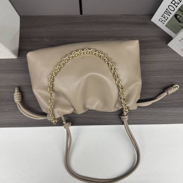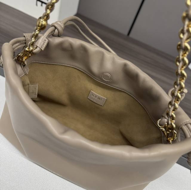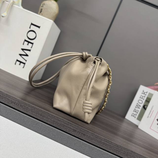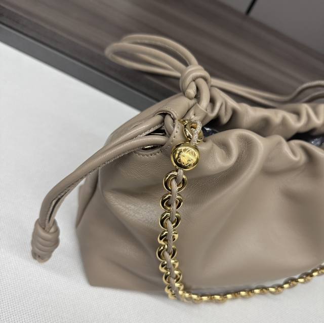 Low柔软纳帕羊皮革 Flamenco Purse 福袋 采用褶皱设计,侧面搭配标志性绳结等关键细节。款式时尚百搭,可作为手拿包携带,亦可搭配甜甜圈链条肩背,或搭配皮革肩带斜挎。此版本采用柔软纳帕羊皮革制成。可肩背、斜挎或手提*可拆卸可调节皮革肩带*可拆卸甜甜圈链条饰*Anagram 镌刻卵石纹*低调的磁扣开合*绒面革衬里烫金或烫银* 配套金屬鏈條加长皮肩帶