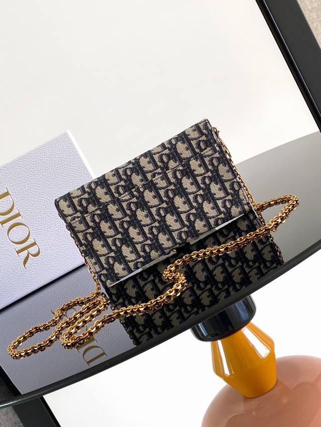 / 这款马鞍链条手袋采用蓝色 Oblique 印花面料等材质精心制作,巧妙融合不同元素,时尚而简约。搭配不对称翻盖,饰以复古金色饰面金属马镫 D 形吊饰。小号款式,
