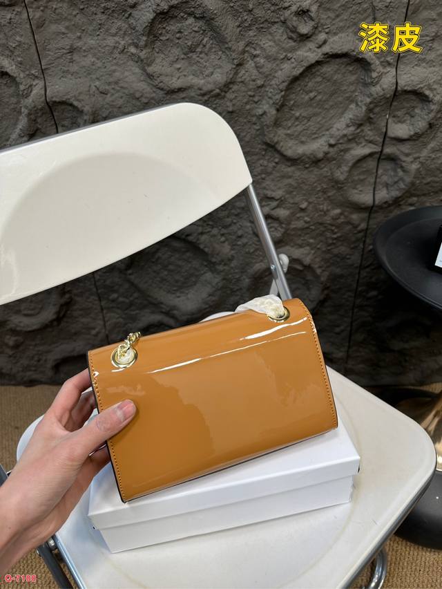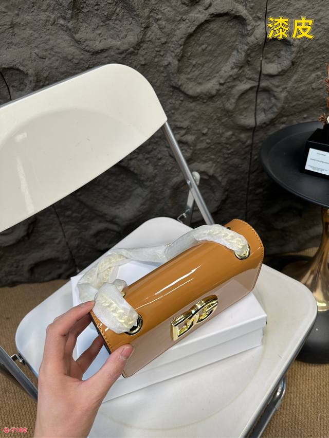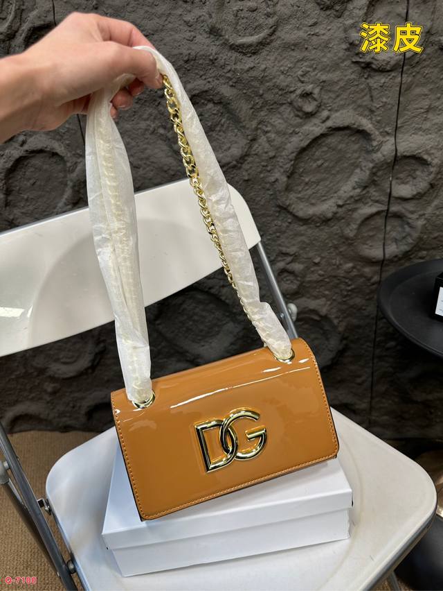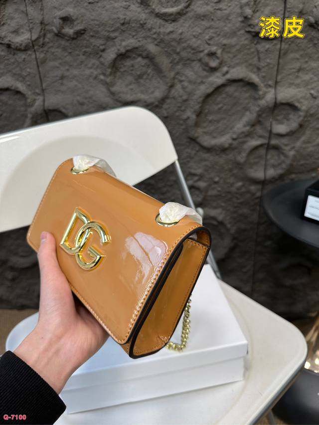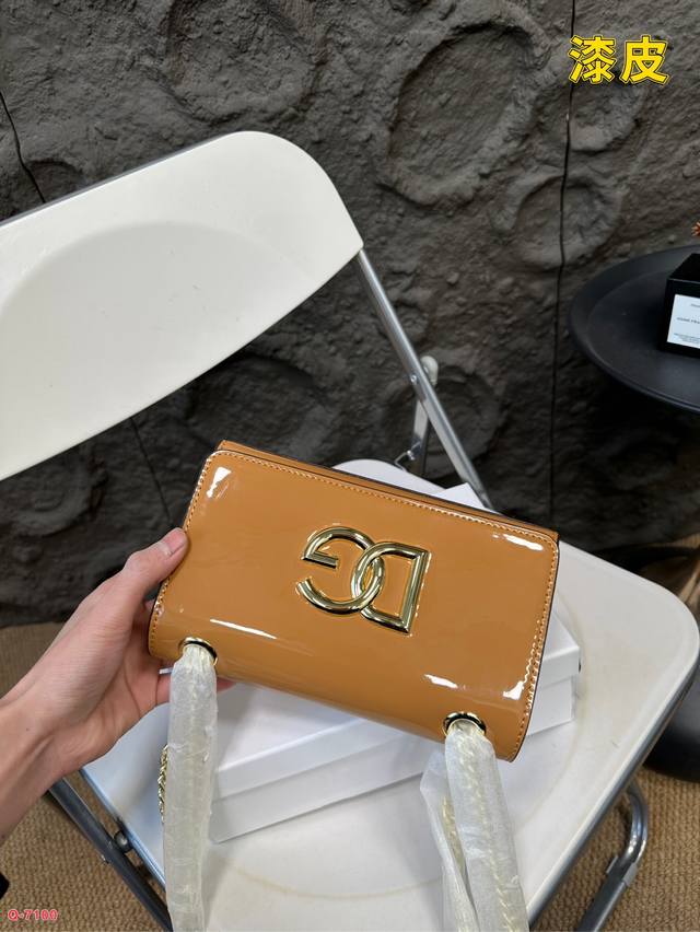 礼盒包装 Dg杜嘉班纳漆皮链条包 正面饰以精致五金大logo 清新的颜色,配以精致的 金属链条,优雅贵气~ 实属时尚达人的标配