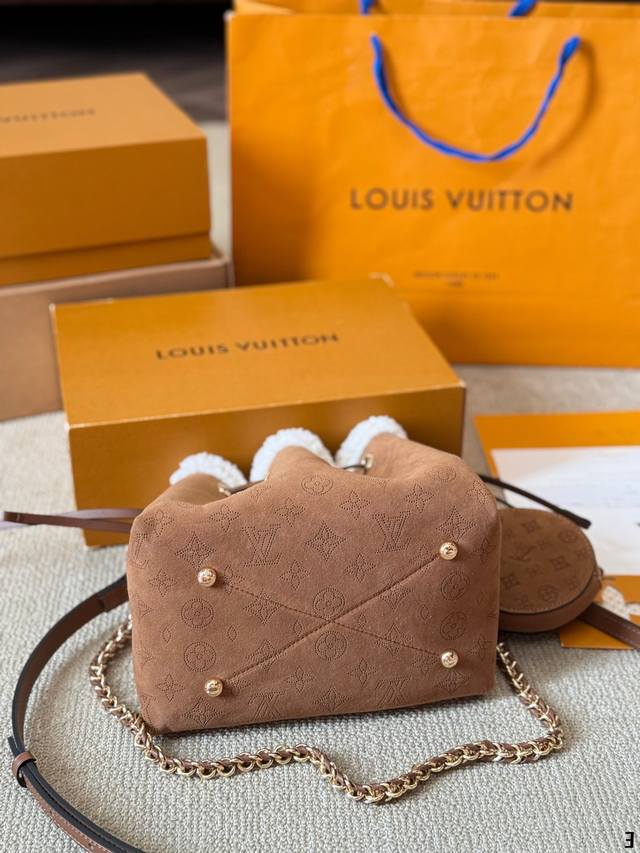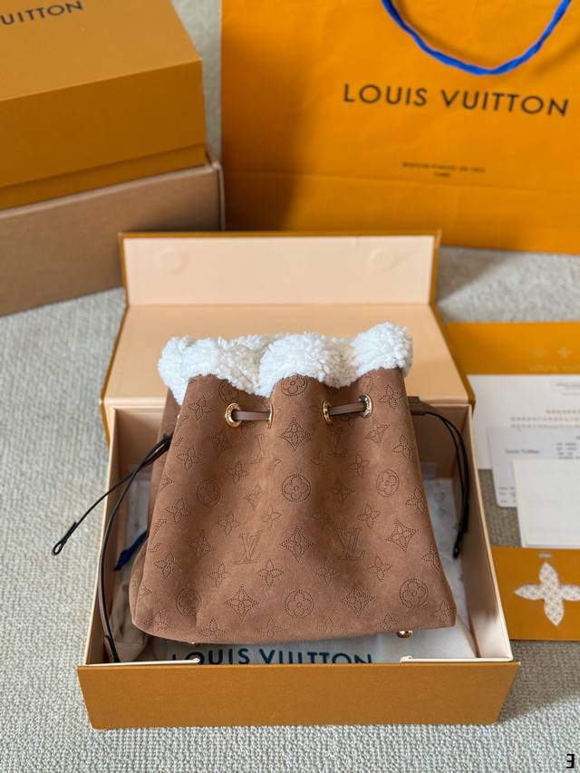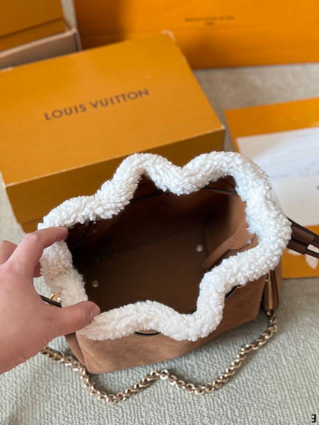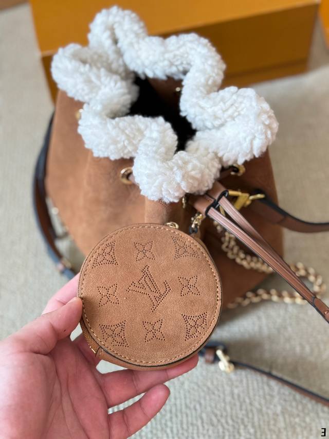 毛绒款bella手袋bella水桶包采用monogram镂花穿孔小牛皮塑造小巧构型,再令相同图案以袖珍比例栖身圆形零钱包,洋溢摩登风尚。金属与皮革编织手柄和 可拆卸皮革肩带实现多种背携方式#毛毛包#25×23