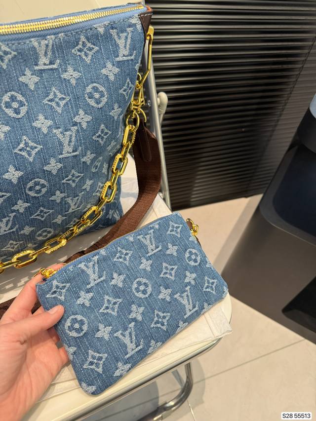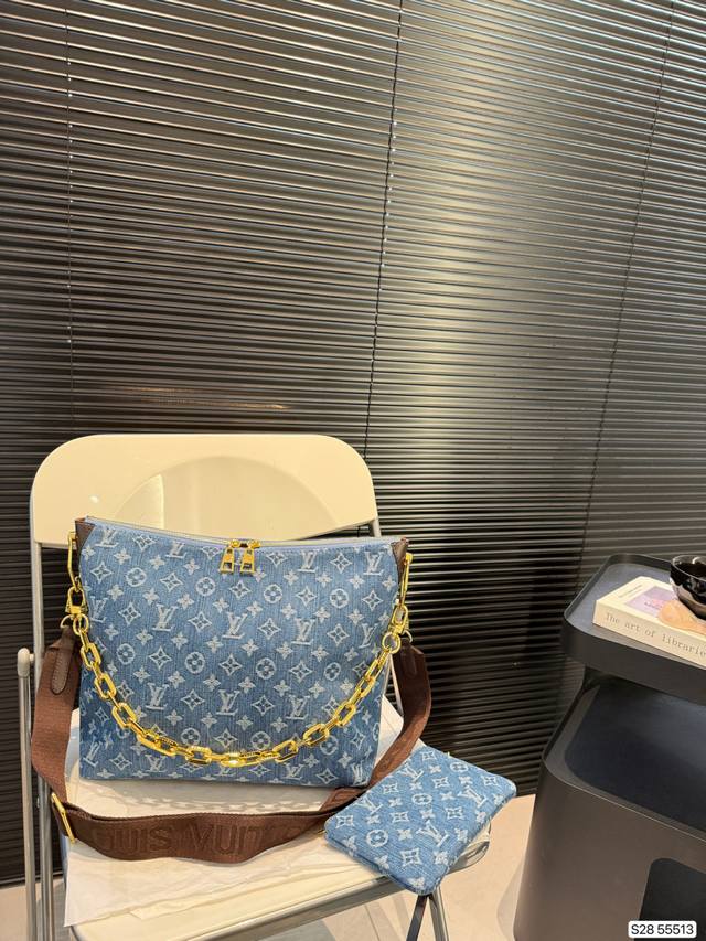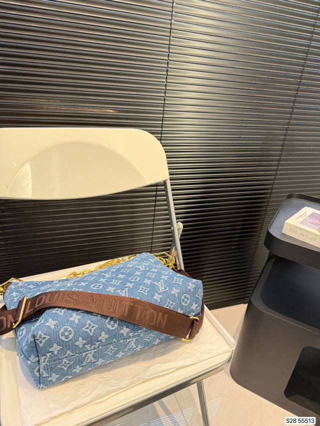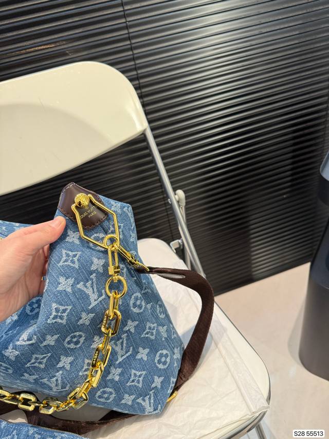 Lv 牛仔走秀新款cousin 时尚博主必备单品,Lv独有的亮金色金属,作为本次设计的肩带粗链条,抓眼球效果非常到位,肩带可拆卸变成手包,妥妥的凹造型!尺寸:30 26 货号55513