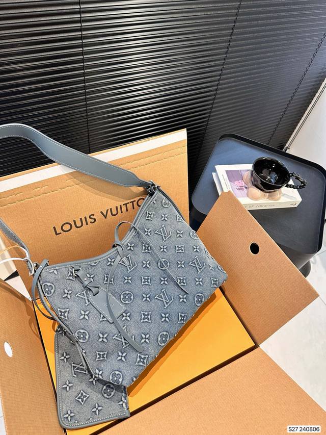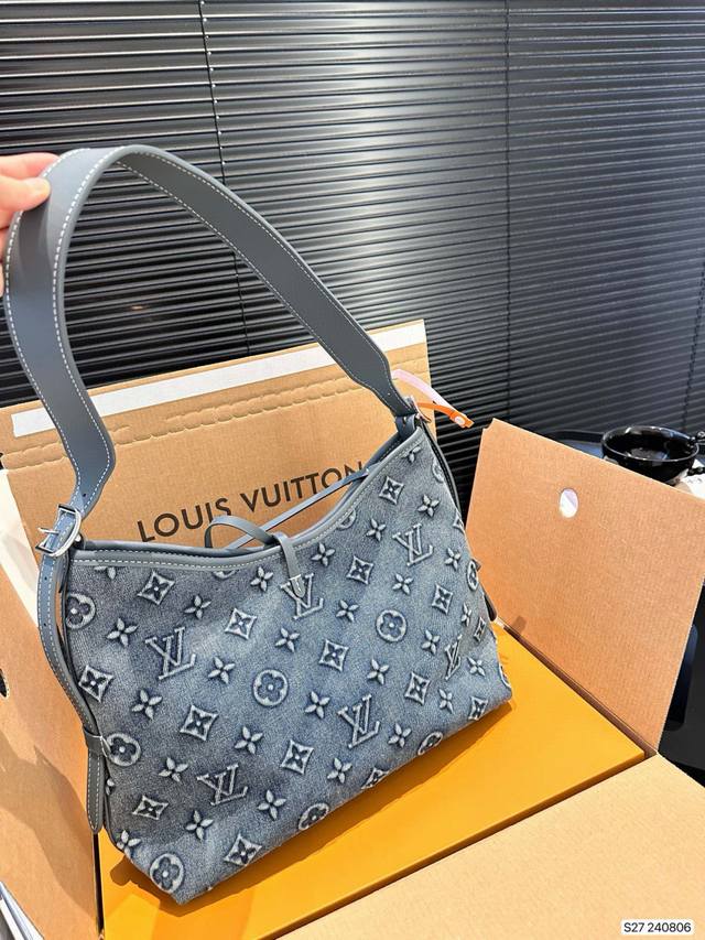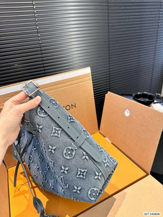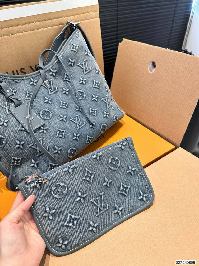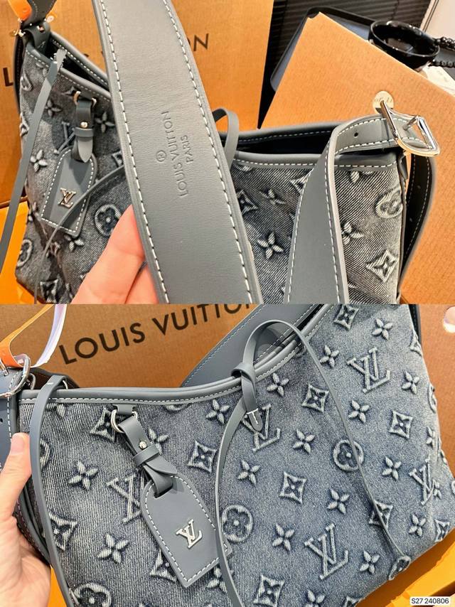 配飞机盒折叠盒子 牛仔carryall V新款,可斜挎、单肩。容量保证,敞口磁铁吸内扣取放平板小电脑非常方便,设计比neverfull小巧、肩带够宽不那么勒;比graceful俏皮,上身完全;是驴家通勤包款颜值担当 尺寸30 26 货号240806