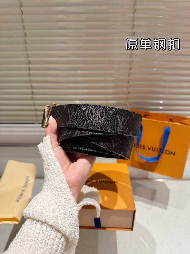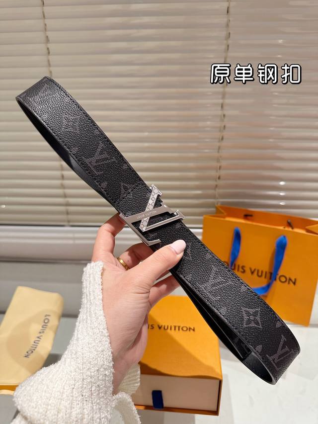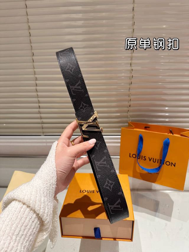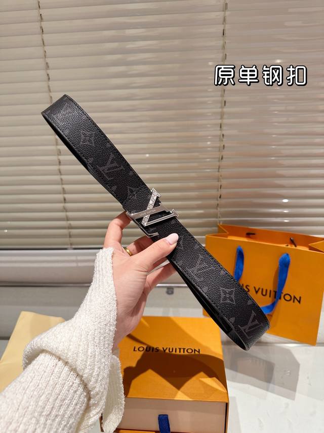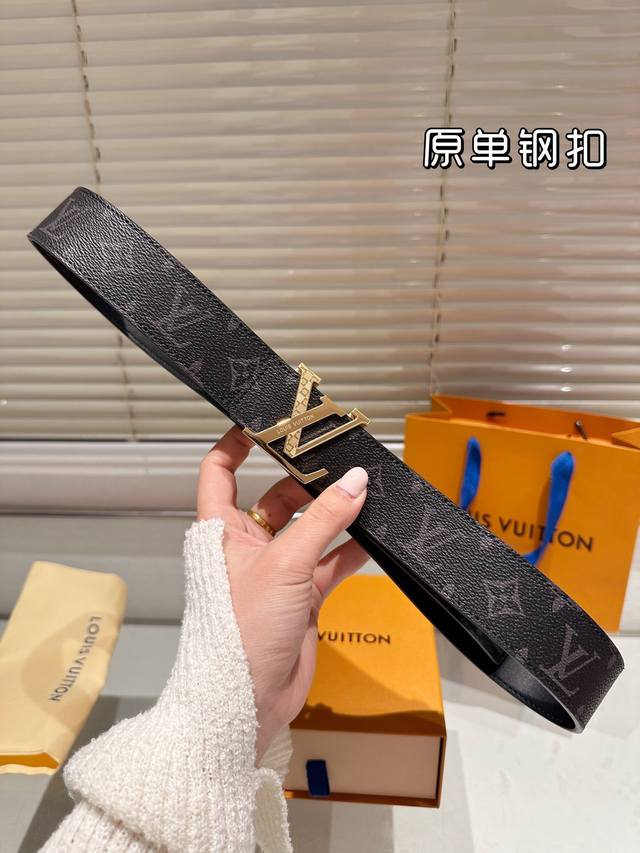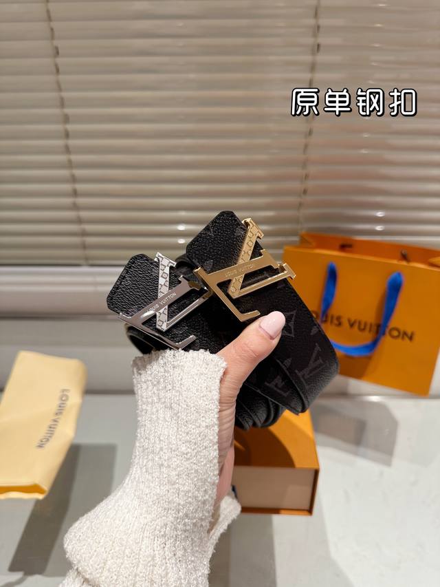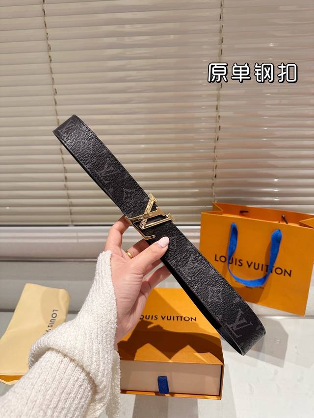 钢扣 高版本!腰带lv牛皮皮带~热门款 男女通用皮带里面最火的版本啦~质量很好 全套包装!五金绝对不褪色 皮带头和专柜一样的哦~ 配礼盒手提袋发票