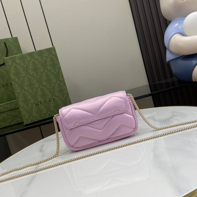 配全套原厂绿盒包装 Gg Marmont系列超迷你手袋。双g配件设计在品牌现代风格中注入传统精髓,为衣橱带来隽永单品。这款超迷你手袋以粉色彩虹效果绗缝v型皮革匠