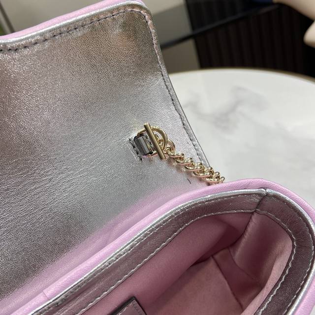 粉色彩虹效果绗缝v型皮革,金色调配件,桑蚕丝缎衬里,随附钥匙扣,可单独与手袋相连双g,链式肩带 60厘米高 重量:约0.35千克。