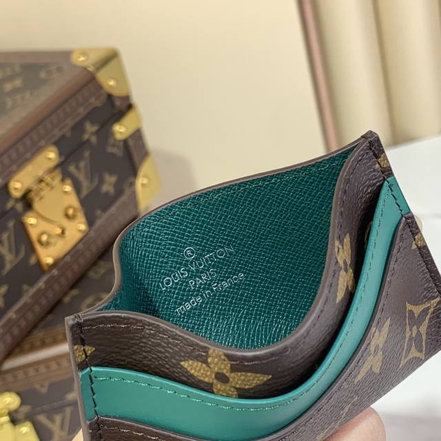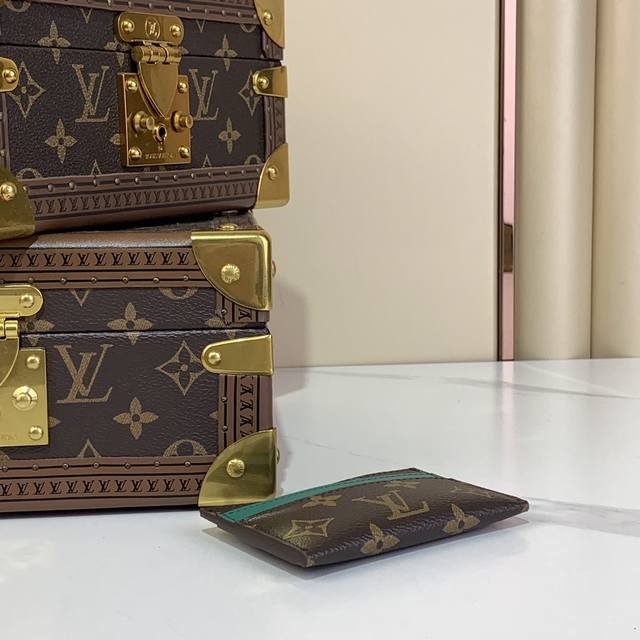 这款帅气的卡夹是monogram Macassar的经典画布之一,搭配着一丝色彩。顶部的彩色牛皮条纹和配套颜色的衬里带来了意想不到的转折。它的四个卡槽和中央口袋可以容纳信用卡、通勤卡和名片。