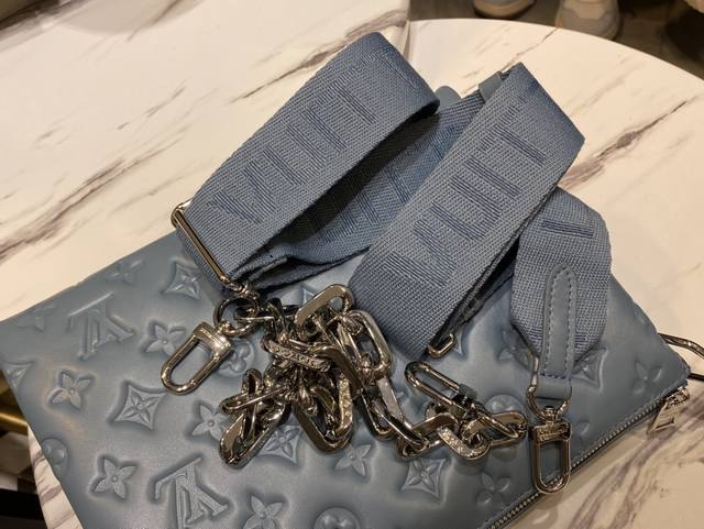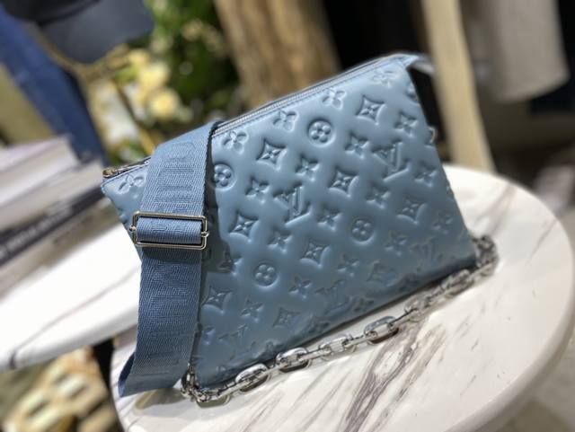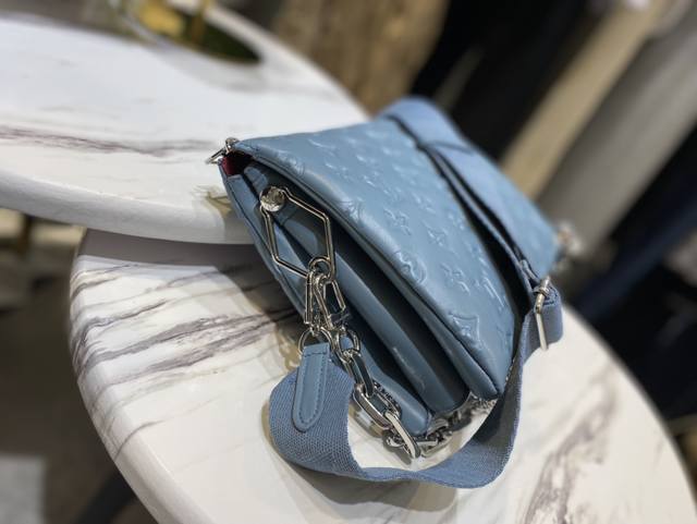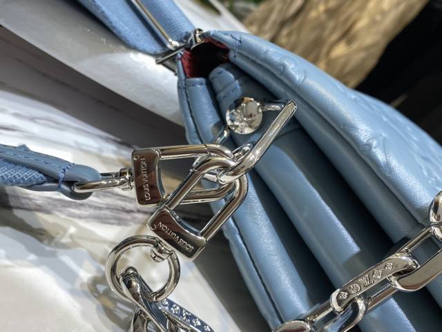顶级原单 M57790M58699雾霾蓝 M59276 玫瑰粉 Coussin 小号手袋于 春夏时装秀大放异彩。Monogram 压纹蓬松绵羊皮打造靠枕构型,为简约设计注入前卫风范。可利用肩带斜挎或化身链条法棍包,亦可于腋下携带。详细特征26 X 20 X 12 厘米