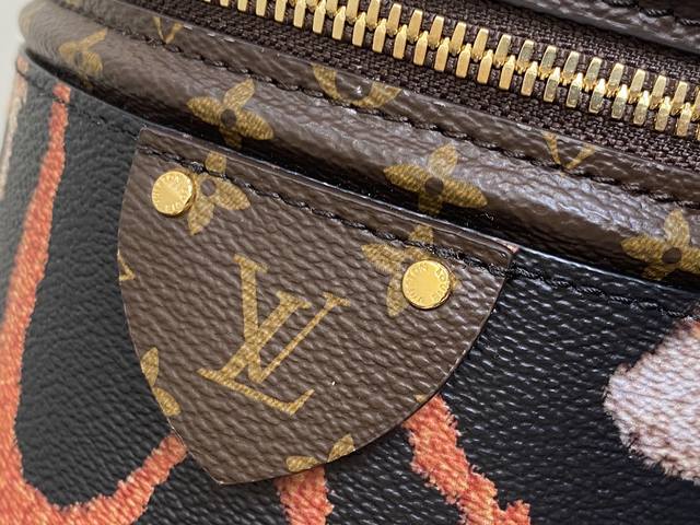 原单精品 M13846豹纹 圆桶包发财包 Vanity 手袋 借鉴历史悠久的 Cannes化妆箱造型,女装艺术总监nicolas Ghesquière以此款半硬质手袋重现昔日经典的魅力。小号尺寸,Monogram与monogram Reverse涂层帆布混合面料,充满传统特色的外观设计,十分雅致。配有顶部手柄和可脱卸皮革肩带,提供多种背携方式。15.0X 17.0X 15.0 Cm ,