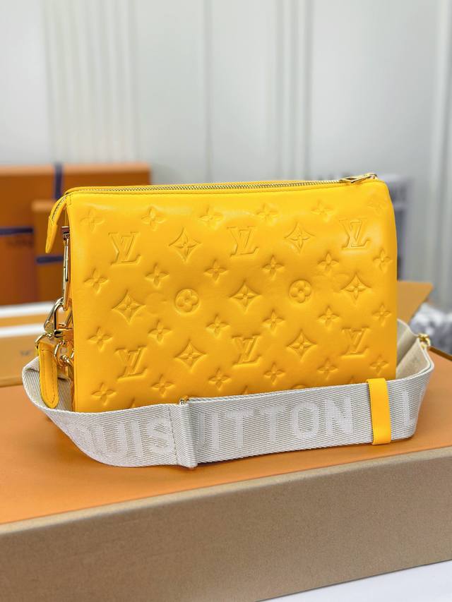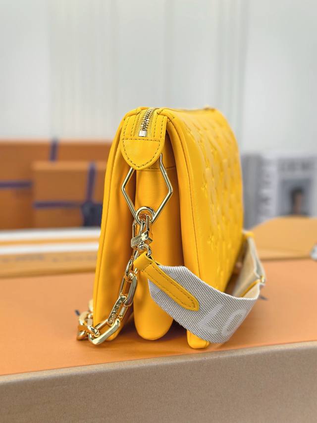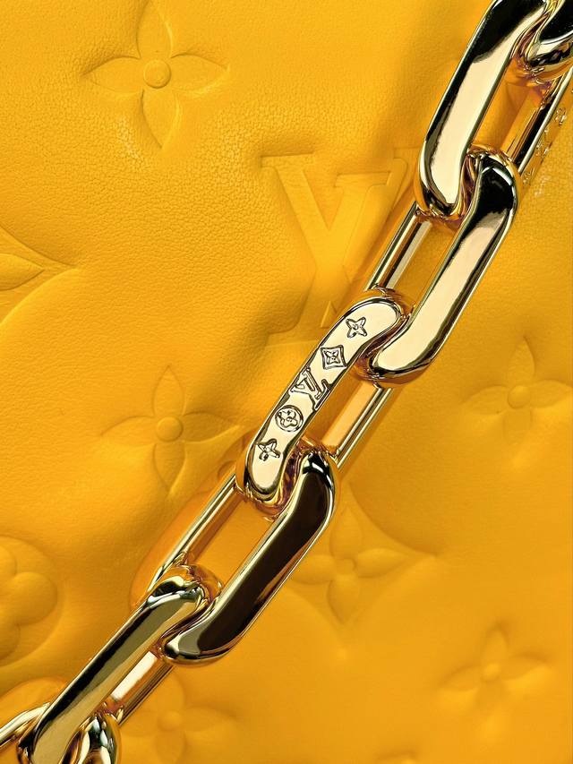 本款 Coussin 小号手袋于 春季系列洋溢明亮色彩。松软羊皮革呈现 Monogram 压纹,粗链条拓展肩背方式,宽幅织物肩带适宜斜挎,可为暖日着装注入清新活力。详细特征26 X 20 X 12厘米 长度 X 高 X 宽