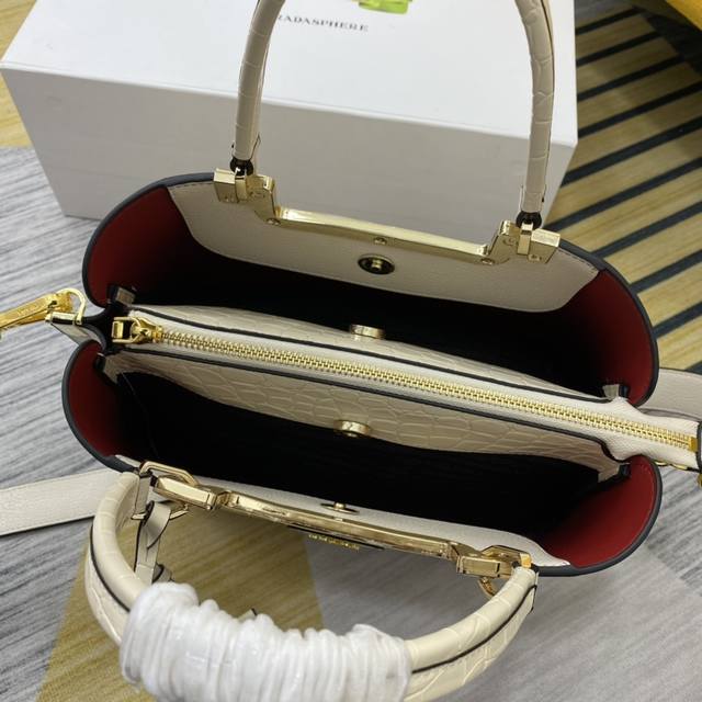 / 年新款 官网劲爆新款 火遍全球 开年新款普拉达prada 款号:66152 尺寸:30*22*14 专柜裁剪手法,采用进口小牛皮搭配亮光鳄鱼纹,质感柔软 包型时