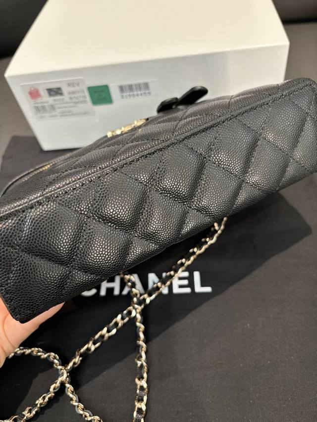 时尚新宠 Chane125C春季新品 精致小巧链条手拿包 颗粒小牛皮配金色金属 手柄还有小logo 皮面上一条有弧度的缝线 让整个包看起来更加力挺 荔枝纹的皮面