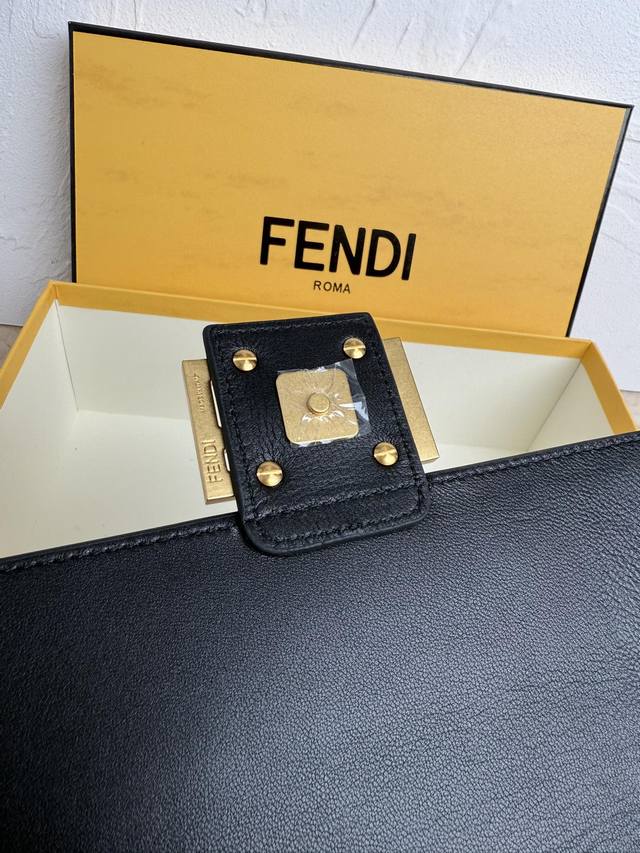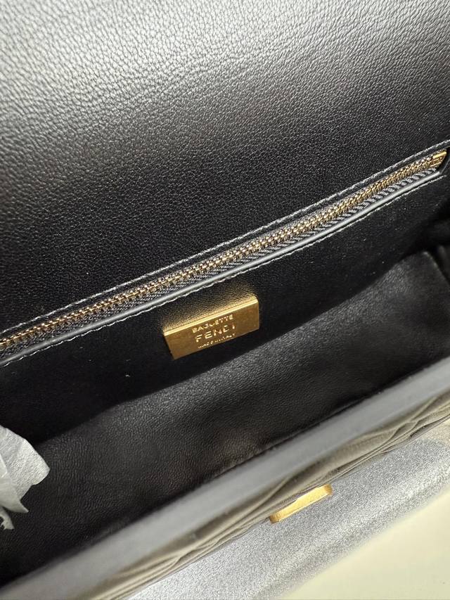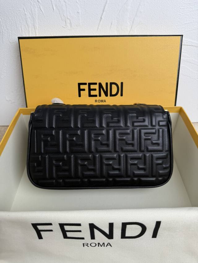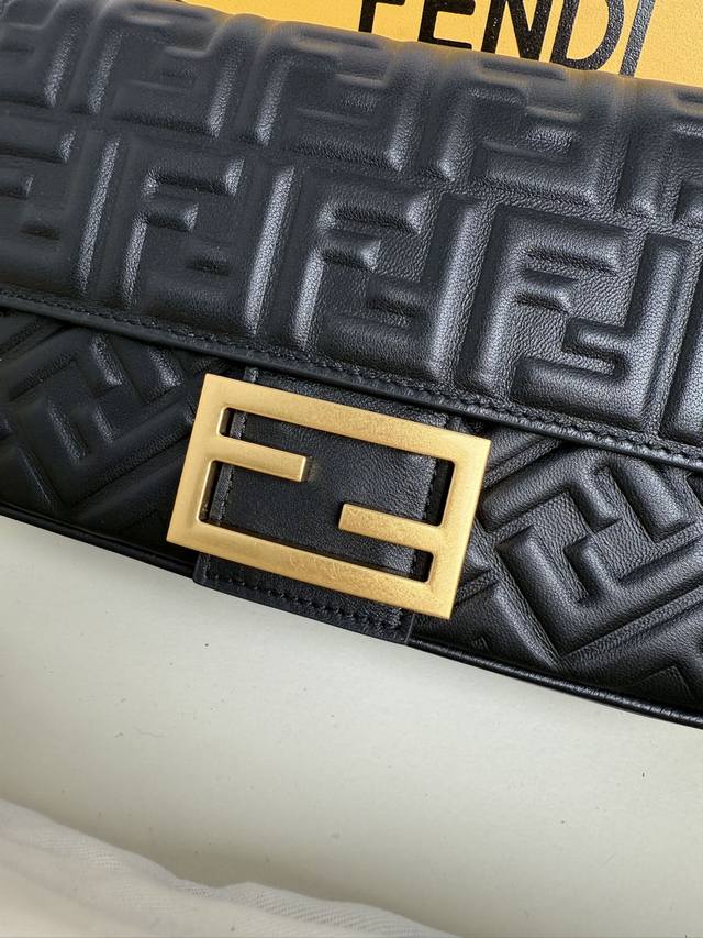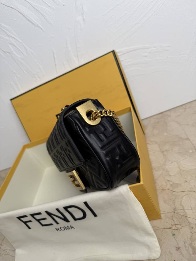 Iconic Baguette中号链条手袋,黑色纳帕软皮革材质,饰有3D纹理ff图案。缀以ff搭扣。设有正面翻盖、磁扣、带衬里的内部隔层、拉链袋和复古金色金属件。配备滑链肩带,可手提或肩挎