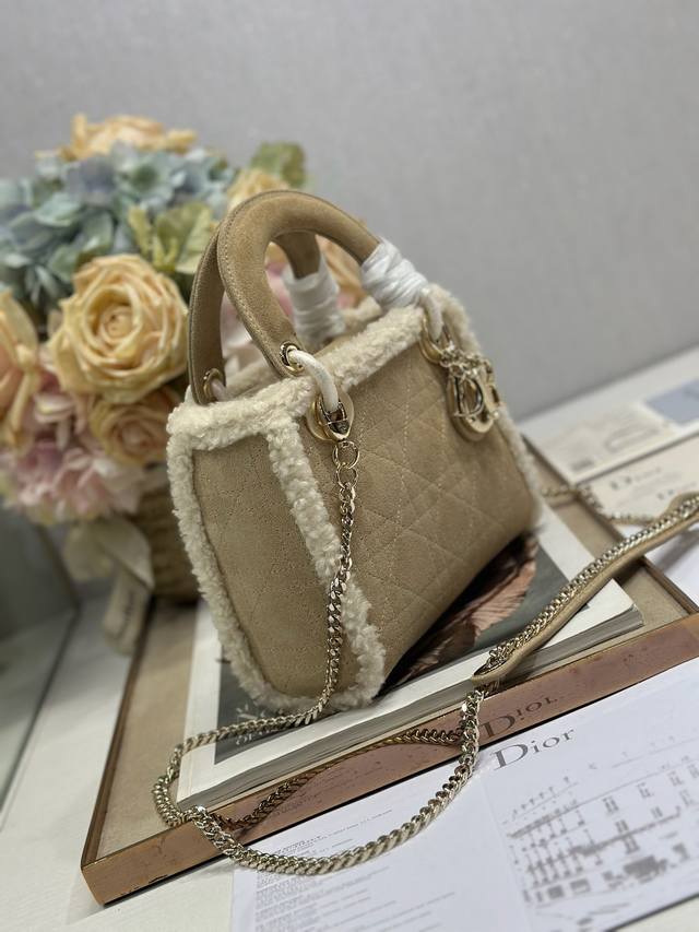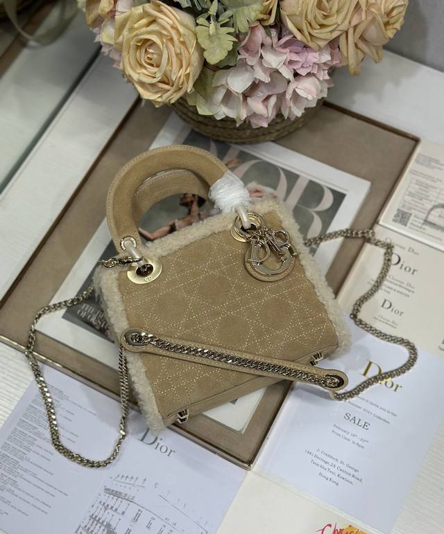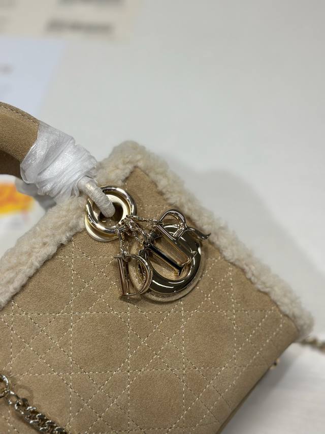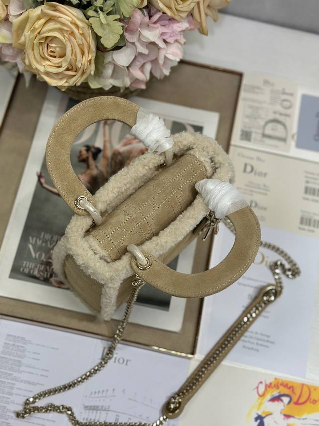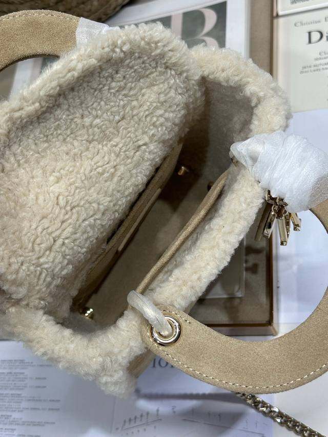 迷你lady D Ior戴妃三格手袋 杏色牛筋皮配毛毛