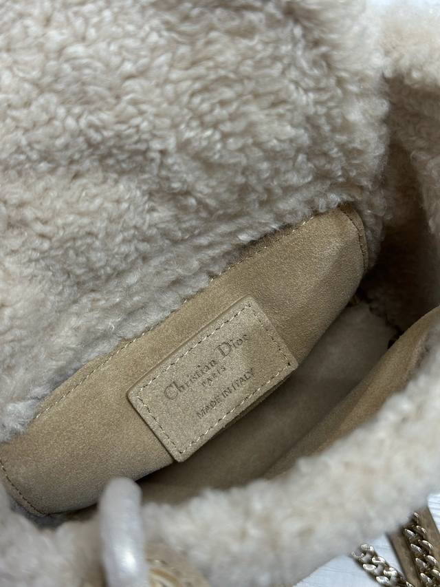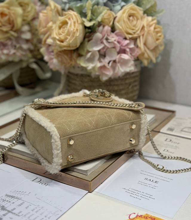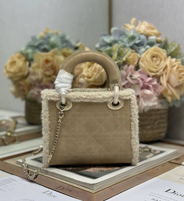 这款 Lady D Ior 手袋集中体现了 D Ior 对优雅和美丽的深刻洞见。时髦典雅的设计经久不衰。采用米色绒面革精心制作,饰以藤格纹缉面线并搭配米白色牛皮革皮毛一体,彰显 D Ior 的精湛工艺。搭配浅金色饰面金属 D.I.O.R. 吊饰,为精美的轮廓增添一分灵动。迷你款式,搭配可拆卸的链条肩带,可手提或斜挎,是晚装的理想伴侣。
