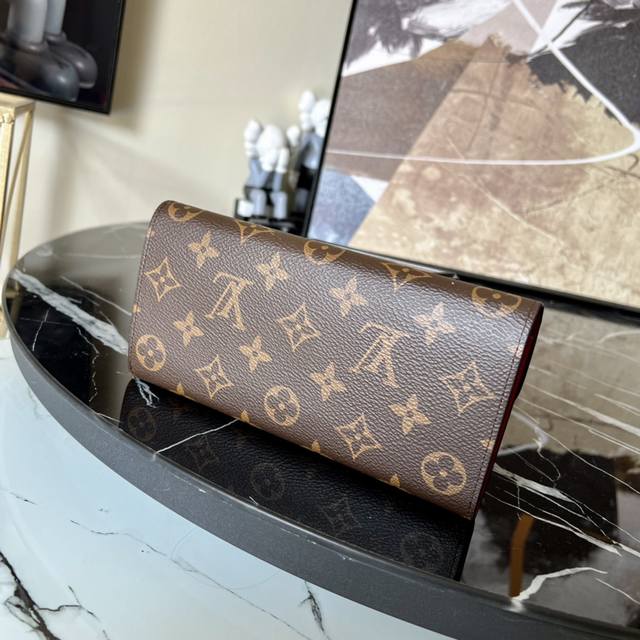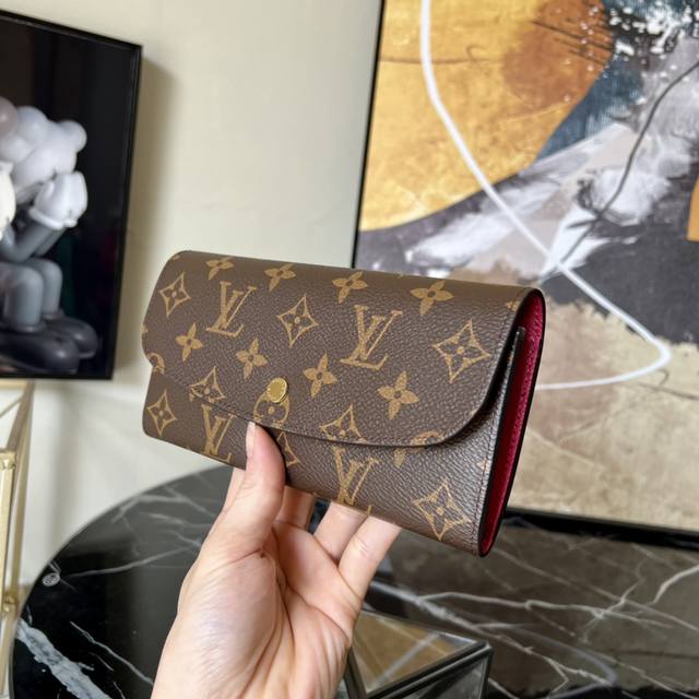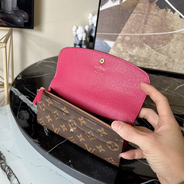 出厂价 M61289老花 玫红 金扣 功能实用且设计华美的 Emilie 钱夹采用柔软的 Monogram 帆布制成 衬以颜色鲜艳的内衬 气质极为优雅 多袋式设计和引人注目的造型赋予其无法抗拒的迷人魅力size:19X10Cm。