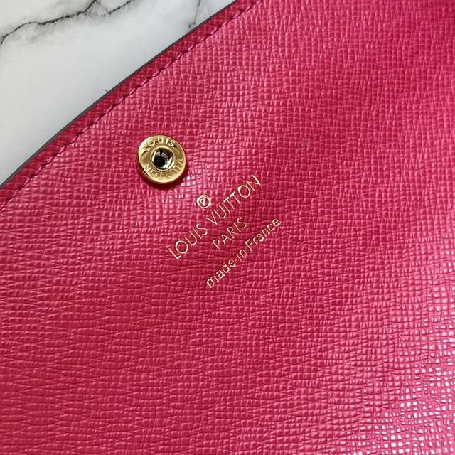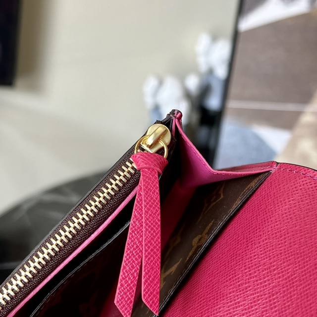 出厂价 M61289老花 玫红 金扣 功能实用且设计华美的 Emilie 钱夹采用柔软的 Monogram 帆布制成 衬以颜色鲜艳的内衬 气质极为优雅 多袋式设