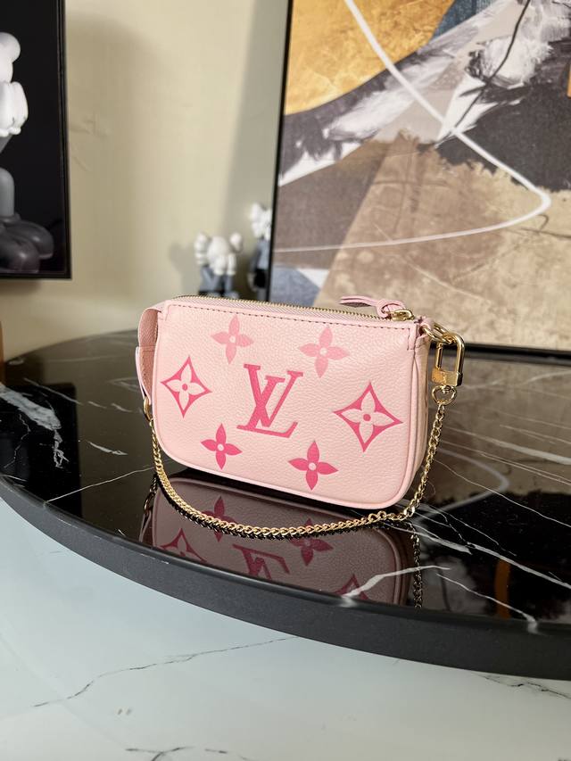出厂价 M80501 粉色 新款麻将包 這款迷你小皮包於by The Pool系列換上新裝,首次以monogram Empreinte皮革打造,綴有漸變色monogram壓花圖案。這款夏季特別版的風格貫徹皮具、配飾及時裝精品,袋身設有金色鏈帶,可繫於手袋或皮帶,適合收納必需物品。