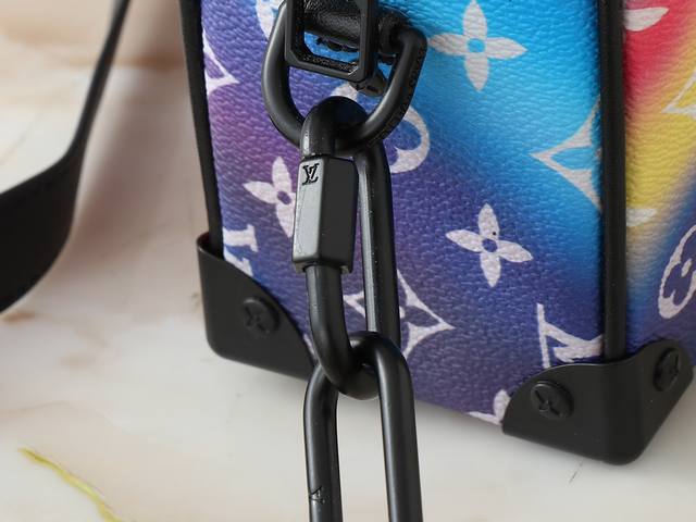 升级原版 M57702 M44480 M68906 M44735 Soft Trunk 迷你手袋取材压印 Monogram 图案的 Taurillon 皮革,搭配铆钉边角和四方造型,承袭路易威登传统硬箱设计之韵。一条哑光链条与拉链衔接,另一条巧妙融入肩带,为精巧设计注入摩登魅力。尺寸:18.5×13×8Cm