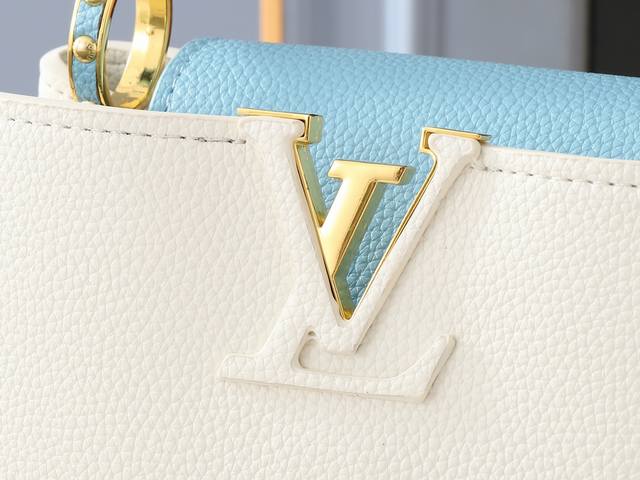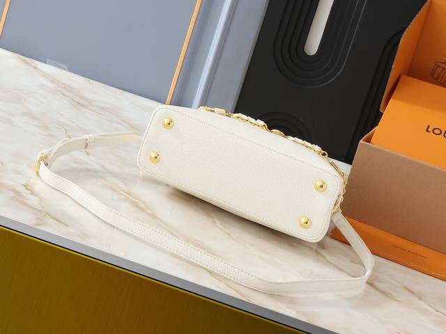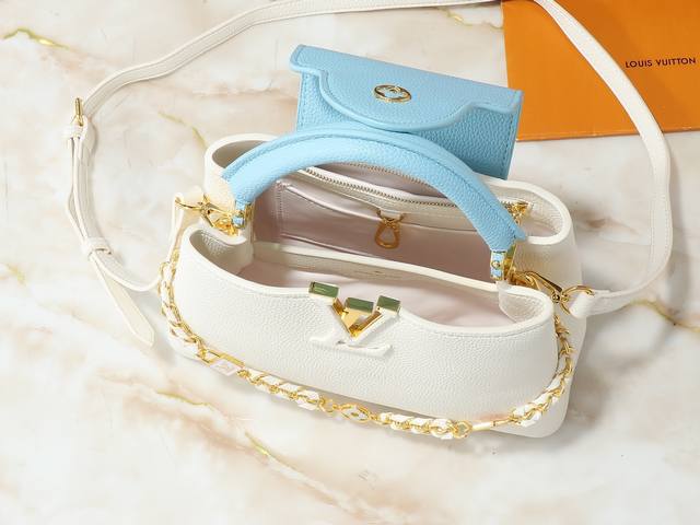 升级原版 M23949 M23950 M24471 M23951本款 Capucines Bb 手袋拥有华美 Lovelock 编织链条,以链环衔接手绘珐琅 Monogram 元素和 Lv 铭纹挂锁。撞色皮革构筑标志性 Lv 标识,雅致气息不言而喻。尺寸:27 X 17.5 X 9.0 厘米 长 X 高 X 宽
