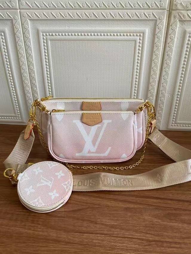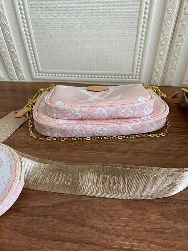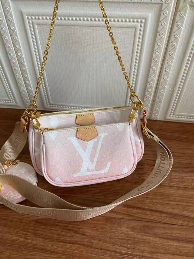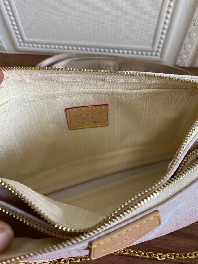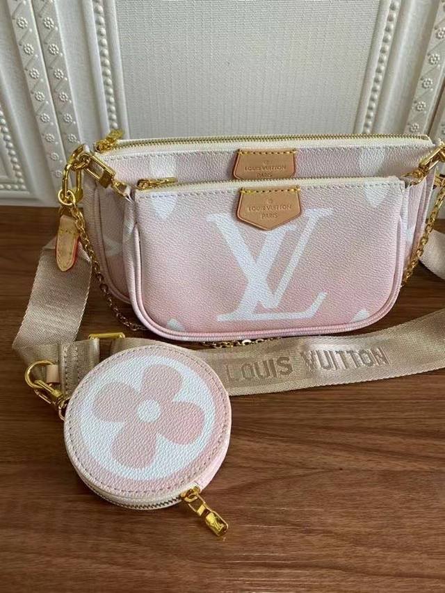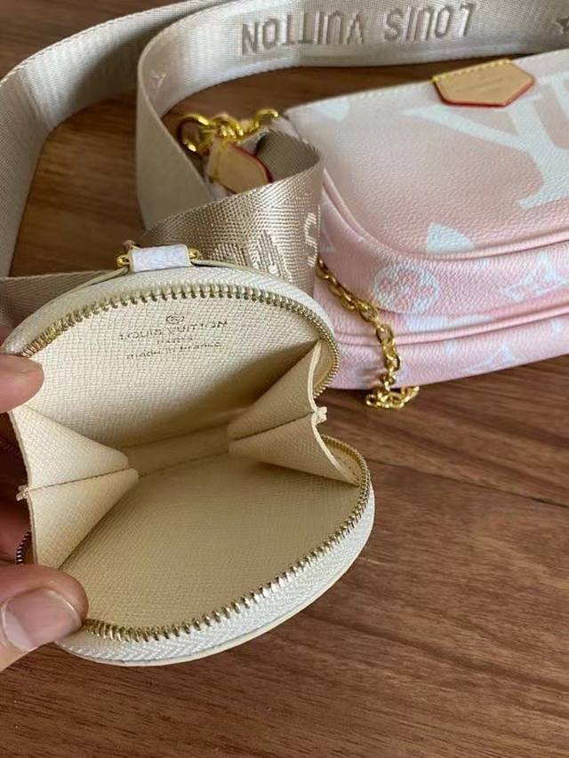 独家实拍M57633蓝色M57634粉色 M44823老花Multi Pochette Accessoires 手袋以 Monogram Giant 帆布打造手袋、手拿包和圆形拉链零钱袋的多变组合。可调节提花肩带抒写字样,实现短肩背或斜挎体验;可拆卸链条带来手拎或肩背选择。尺寸:24 X 13.5 X 4 厘米