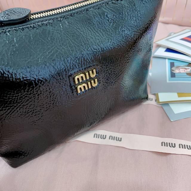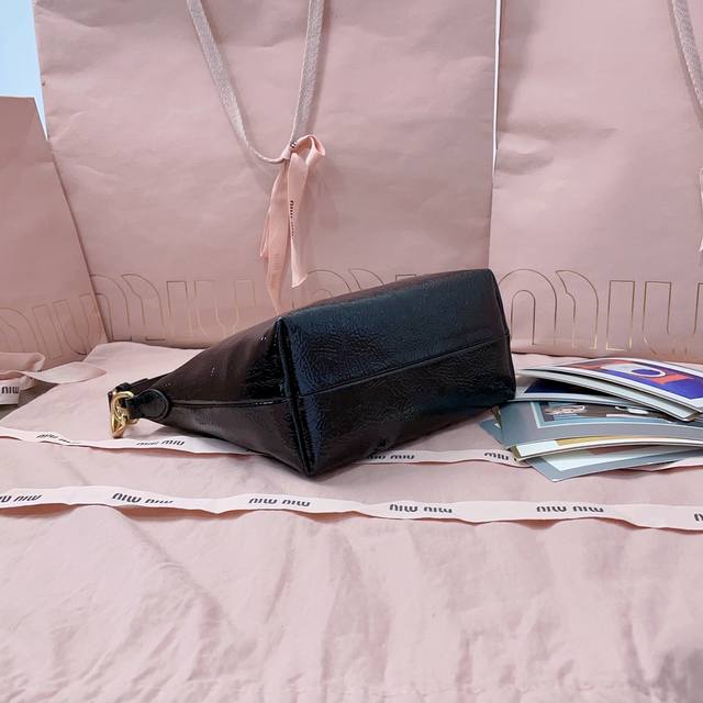 5Ne841,新品油蜡漆皮饭盒包,独特的冰裂纹理,正面标志性 Miu金额Logo,棉布内里,超轻,容量大,怎么搭都好看,一年四季都适用,尺寸:底长19Cm,开口