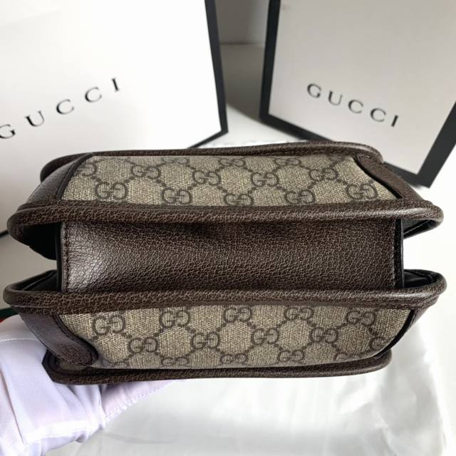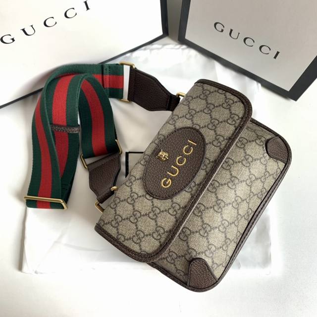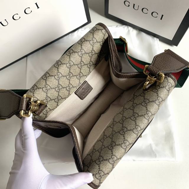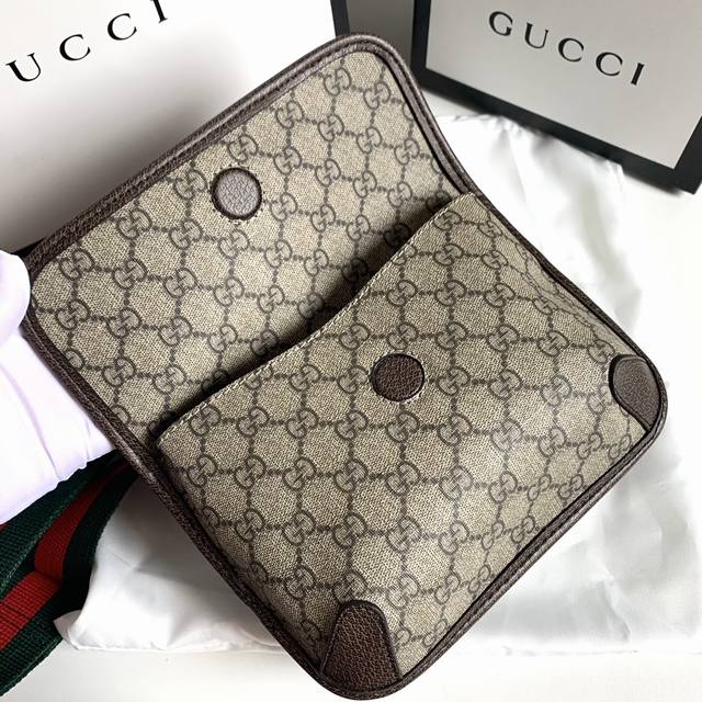 Gg Suprememini邮差包,助你玩转今年秋冬时尚圈~经典的Pvc料搭配棕色牛皮,五金虎头小五金件搭配红绿可调节肩带,采用复古风格设计,每侧均配有翻盖扣。中央开口隔层可以使用磁片打开。