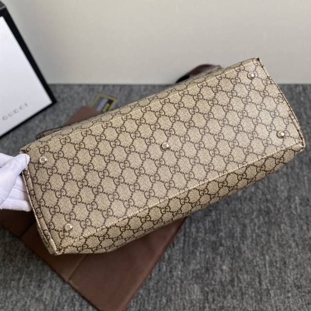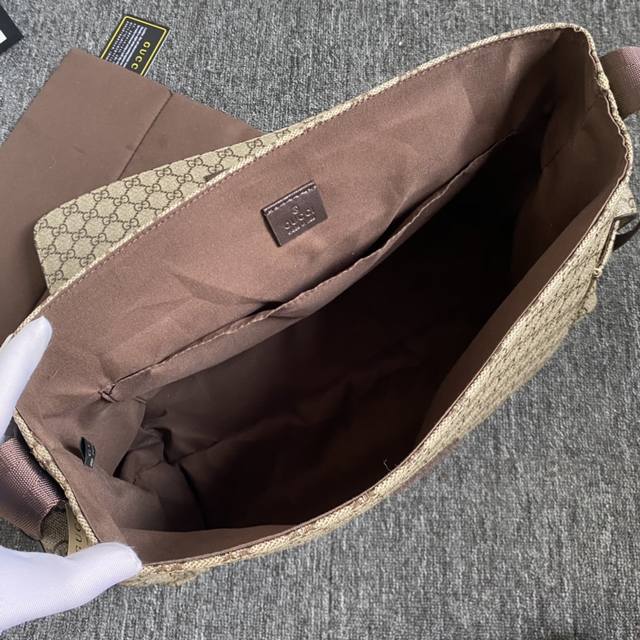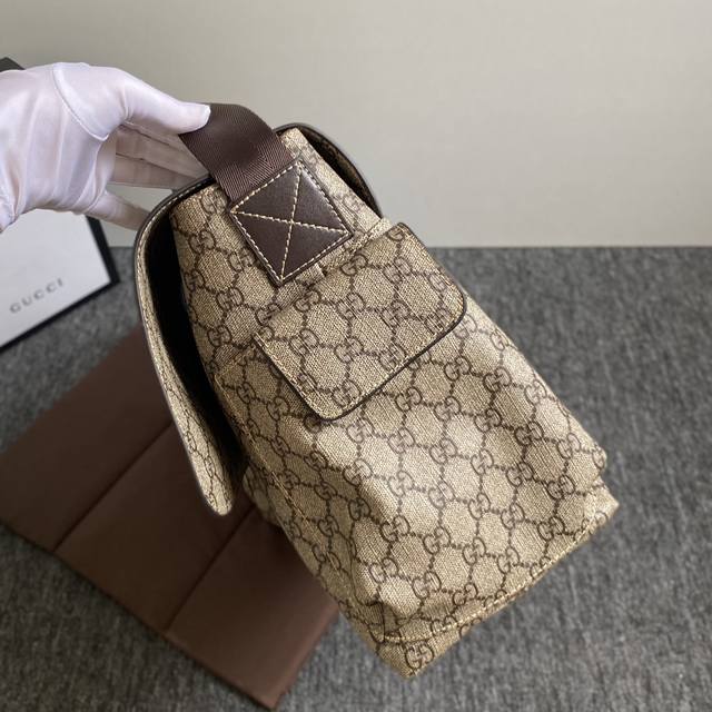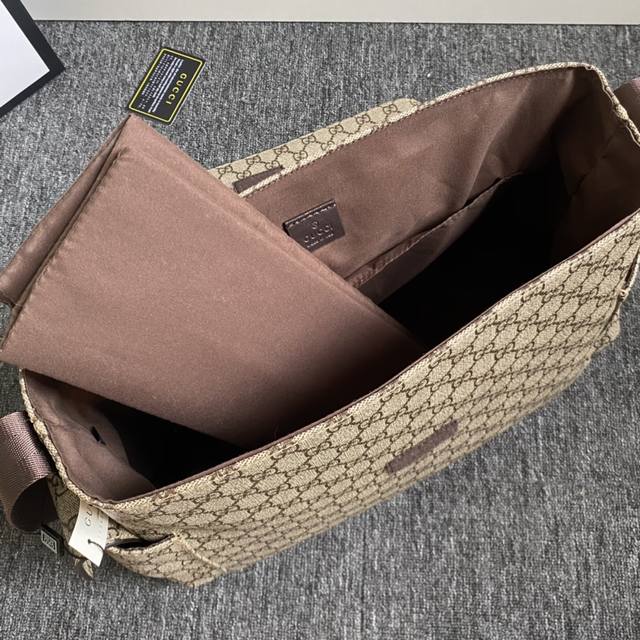 Gucci 大火妈咪包又称Diaper Bag,容量很大,两边有侧口袋可容纳水瓶。大翻盖设计很是方便,配有折叠垫子。男女通用款!采用进口面料和啡色皮革搭配,肩带调节
