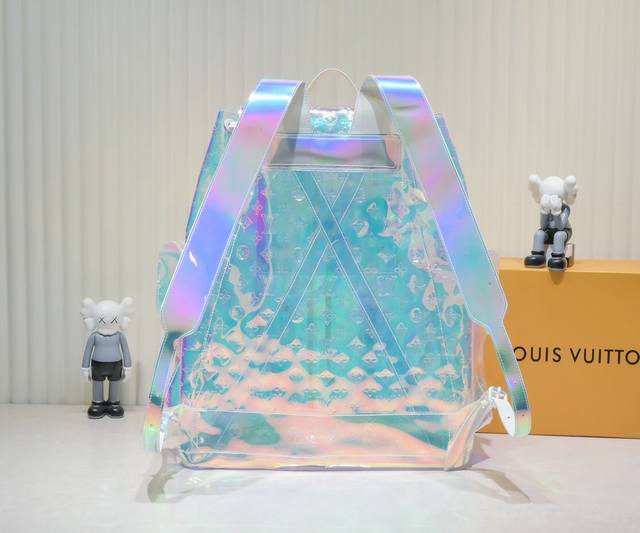 独家实拍-升级版 型号M53286 M41379 透明炫彩!Chrlstopher大号双肩包此款多彩的Christopher大号双肩包,展现了路易威登男装艺术总监Virgil Abloh的超前视野:个人的青春活力与路易威登经典优雅内涵的碰撞交织,Monogram印花Pvc材质,大尺寸设计,搭配大胆的彩虹色调,十分亮眼,实现了时尚格调与实用特质的巧妙融合,曾于2004年秋冬季首次亮相,以登山背包为灵感的大尺寸设计,是旅行及周末出游的理想之选,大号外袋十分实用,而金属饰钉与Lv字母包饰则作为点睛之笔凸显品牌内