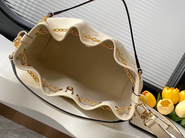 头层皮M47209黑色,M25453杏印,M25452奶白压花本款 Lv Bundle 手袋为 Monogram Empreinte 皮革搭配莹亮金属件,以抽绳链释放瞩目光采。雅致手柄和可拆卸并调节的肩带提供手拎、斜挎和肩背体验,轻松打造昼夜皆宜的夏日造型。