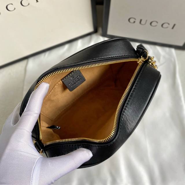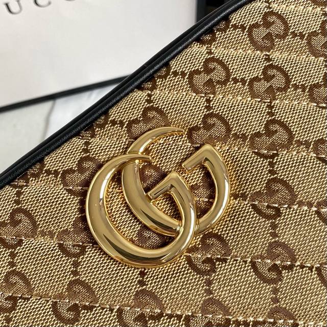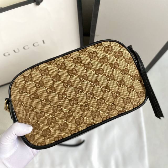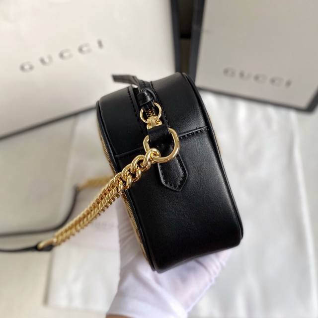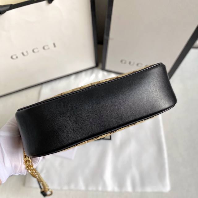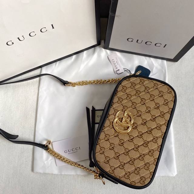 升级版实拍# 型号:447632杏布黑 尺寸:24-13-7Cm Gg Marmont春夏系列相机包 包身采用帆布配皮减轻自重 链条搭配牛皮肩带使单肩斜挎更轻松